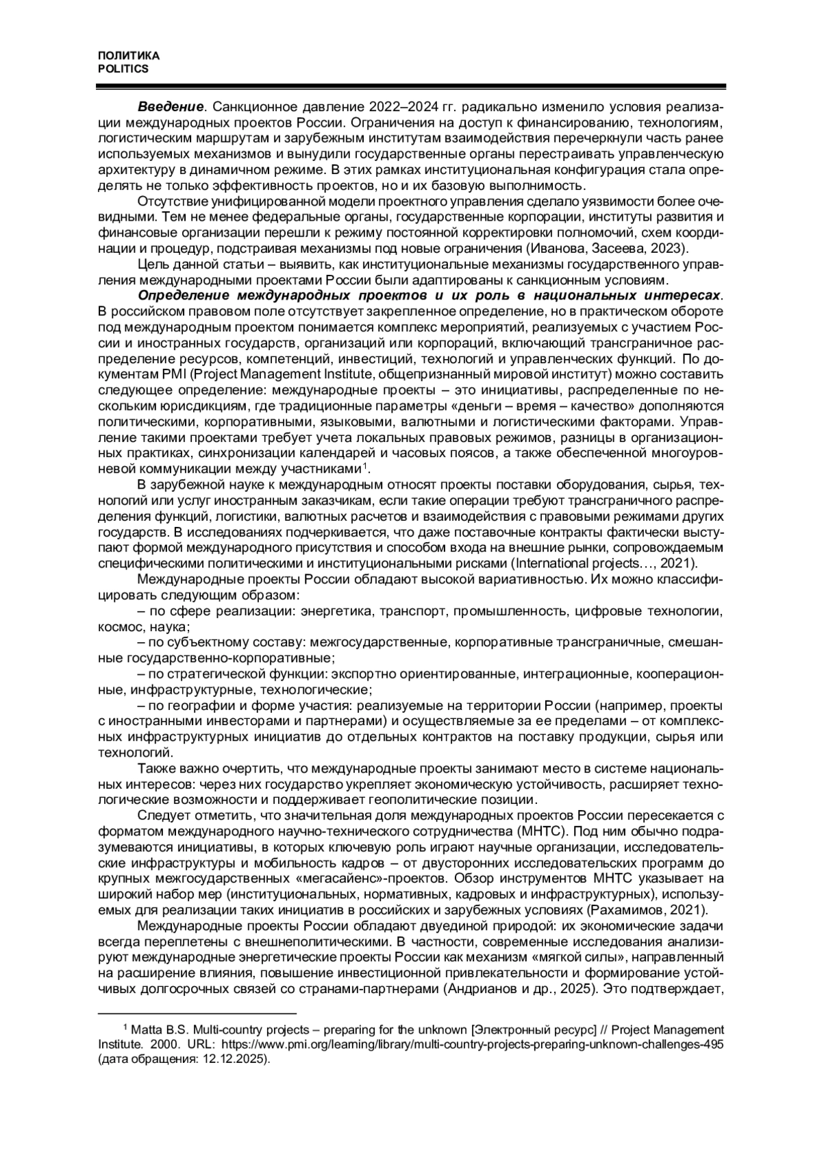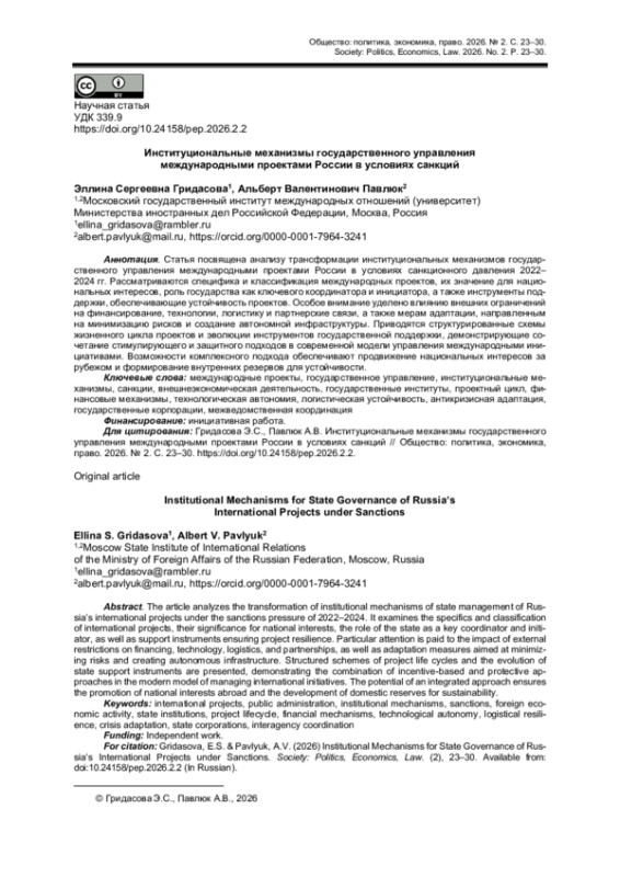 Статья посвящена анализу трансформации институциональных механизмов государственного управления международными проектами России в условиях санкционного давления 2022-2024 гг. Рассматриваются специфика и классификация международных проектов, их значение для национальных интересов, роль государства как ключевого координатора и инициатора, а также инструменты поддержки, обеспечивающие устойчивость проектов. Особое внимание уделено влиянию внешних ограничений на финансирование, технологии, логистику и партнерские связи, а также мерам адаптации, направленным на минимизацию рисков и создание автономной инфраструктуры. Приводятся структурированные схемы жизненного цикла проектов и эволюции инструментов государственной поддержки, демонстрирующие сочетание стимулирующего и защитного подходов в современной модели управления международными инициативами. Возможности комплексного подхода обеспечивают продвижение национальных интересов за рубежом и формирование внутренних резервов для устойчивости.