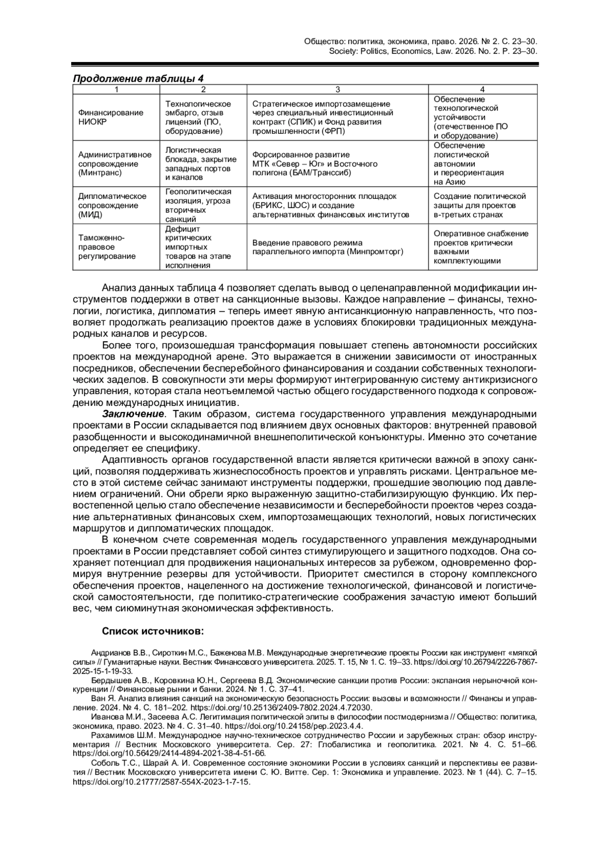 Санкционное давление 2022–2024 гг. радикально изменило условия реализации международных проектов России. Ограничения на доступ к финансированию, технологиям, логистическим маршрутам и зарубежным институтам взаимодействия перечеркнули часть ранее используемых механизмов и вынудили государственные органы перестраивать управленческую архитектуру в динамичном режиме.