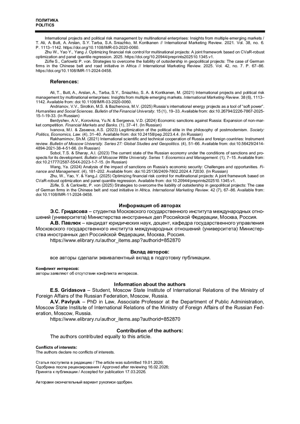 9. Züfle S., Carlowitz P. von. Strategies to overcome the liability of outsidership in geopolitical projects: The case of German firms in the Chinese belt and road initiative in Africa // International Marketing Review. 2025. Vol. 42, no. 7. P. 67-86. DOI: 10.1108/IMR-11-2024-0458 EDN: YVXQYZ