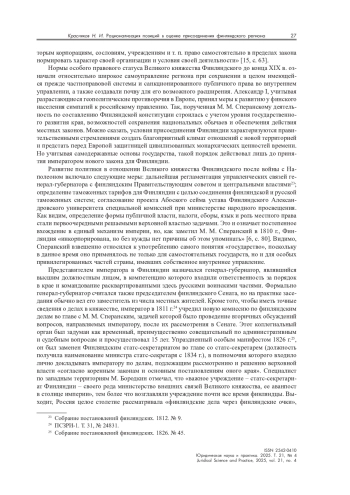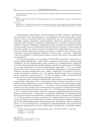 Определяются преобладающие в общественном сознании позиции в исследовании правовой природы процесса присоединения финляндских территорий к России периода XVIII – начала XIX века, при этом устанавливается взаимосвязь таких категорий, как империя, этнополитика, регион, автономизация, унификация, иерархическая структура. На основе законодательства, архивных материалов, установок политических деятелей и мнений исследователей последовательно рассматриваются условия, направления, этапы и средства включения региона в единое политико-правовое пространство имперского государства. Автором формируется убеждение, что утвердившийся административно-территориальный автономизм стал результатом санкции верховной власти России, которая в регионе была представлена самим императором как «Великим князем Финляндским» и его представителем, генерал-губернатором как высшим должностным лицом княжества и председателем в финляндском Сенате.