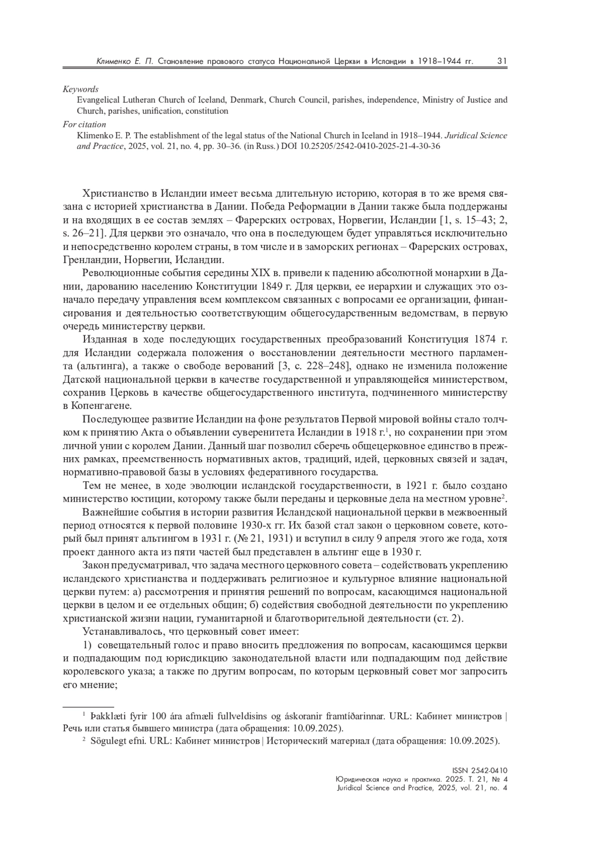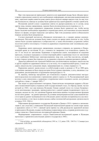 Определяются основные направления правового регулирования деятельности Евангелическо-лютеранской церкви в качестве национальной в Исландии в период становления ее государственности (1918–1944). Рассматриваются изменения в статусе Евангелическо-лютеранской церкви с обретения государственного суверенитета Исландии до разрыва личной унии с королем Дании в 1944 г., что обусловлено: а) верховенством до принятия в 1849 г. Конституции Дании, лишившей короля права руководства церковной организацией; б) обретением государственного суверенитета и созданием собственного министерства юстиции и церкви. Раскрыты основные направления деятельности Евангелическо-лютеранской церкви Исландии в исследуемый период, но в рамках единой государственной парадигмы, а также создание исландского Церковного совета в 1931 г. в качестве будущего органа внутреннего управления местной церковной организации.