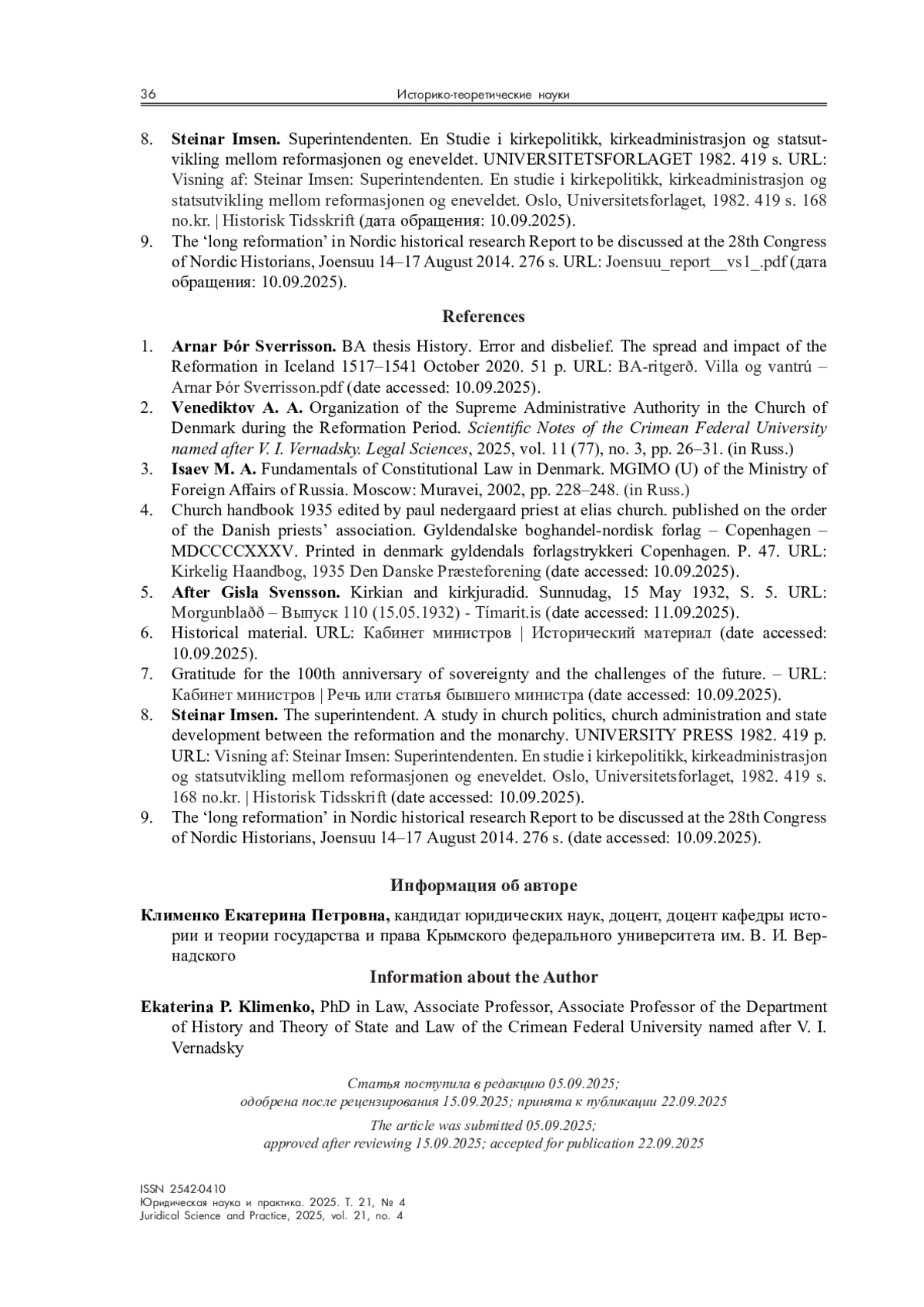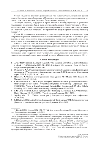 2. Венедиктов А. А. Организация высшей административной власти в церкви Дании в период реформации // Ученые записки Крымского фед. ун-та им. В. И. Вернадского. Юридические науки. 2025. Т. 11 (77). № 3. С. 26-31.