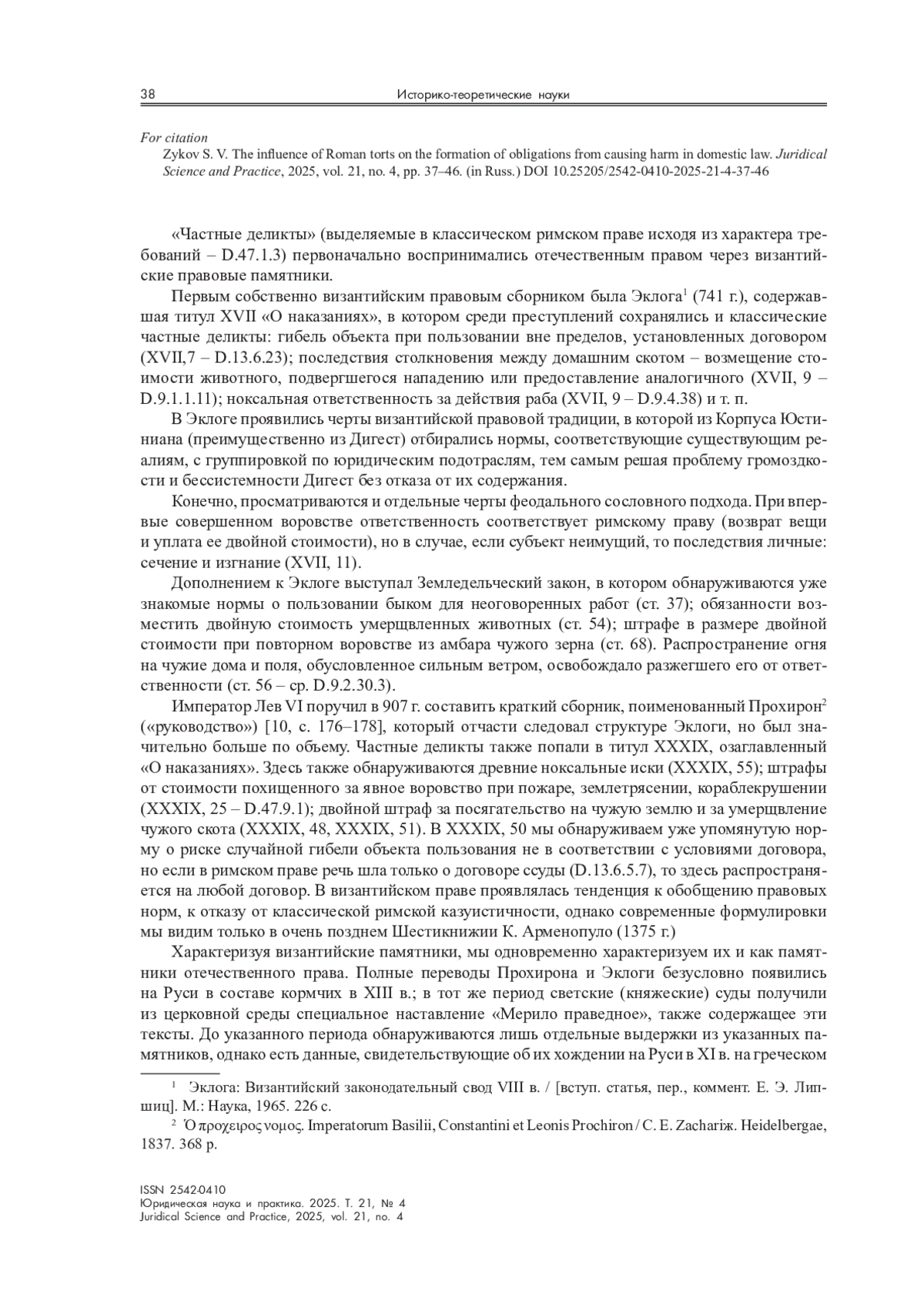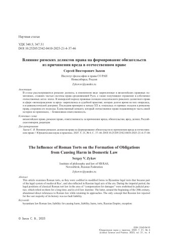 В статье рассматриваются римские деликты, в измененном виде закрепленные в византийских правовых памятниках, ставших частью системы права средневековой Руси, а также получившие отражение в собственно отечественных актах эпохи. В имперский период правовые позиции классического римского деликтного права в сфере «вознаграждения за вред» закреплялись в судебной практике, которая долгое время на них опиралась, и в цивилистической доктрине. Последняя примерно к началу XX в. отказалась от прямых отсылок к римскому праву, сохранив его подходы. Единственный концепт, который отечественное право подавляющую часть своей истории не принимало, – безвиновная ответственность.
