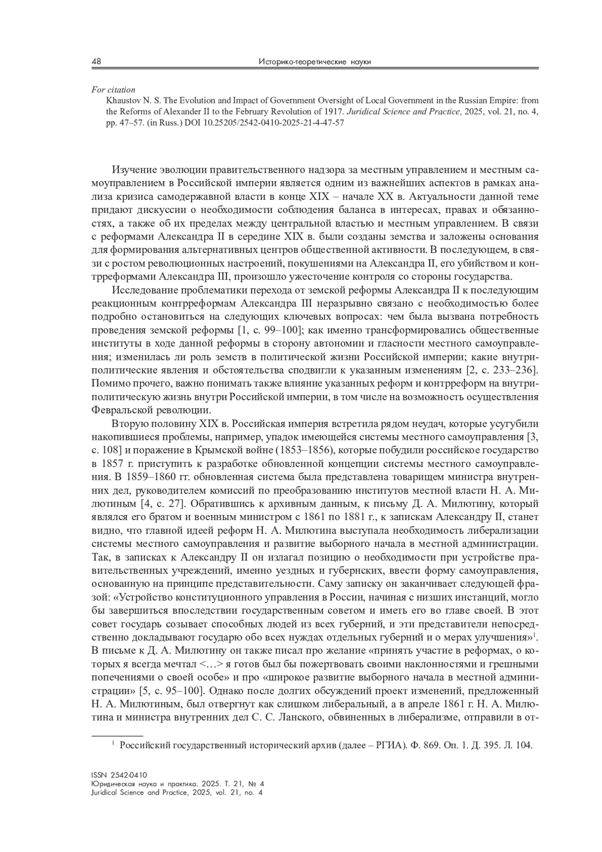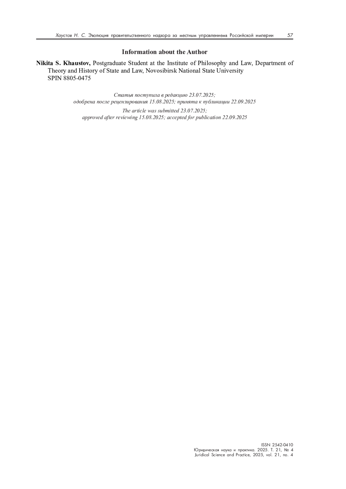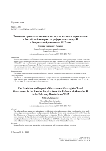 Автором анализируются, обобщаются и оцениваются в диалектическом единстве различные стороны трансформации механизмов правительственного контроля за местным управлением в Российской империи в период с 1850 по 1917 год: от либеральных начал земской и городской реформ Александра II до ужесточения административного надзора при Александре III. Особое внимание уделяется противоречиям между земствами и центральной властью, в том числе ограничению их автономии Положением 1890 года, усилению роли губернаторов, а также влиянию этих процессов на формирование факторов Февральской революции.