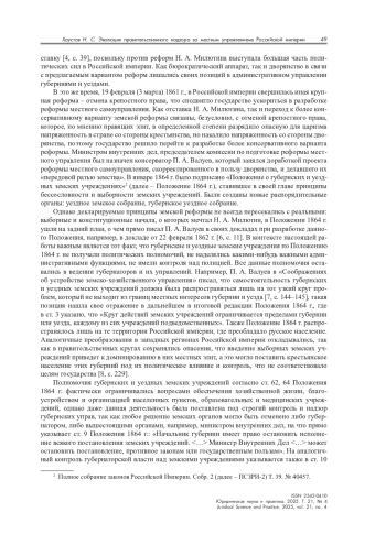 Однако декларируемые принципы земской реформы не всегда пересекались с реальными: выборные и конституционные начала, о которых мечтал Н. А. Милютин, в Положении 1864 г. ушли на задний план, о чем прямо писал П. А. Валуев в своих докладах при разработке данного Положения, например, в докладе от 22 февраля 1862 г. [6, с. 11]. В контексте настоящей работы важным является тот факт, что губернские и уездные земские учреждения по Положению 1864 г. не получали политических полномочий, не наделялись какими-нибудь важными административными функциями, не имели контроля над полицией. Все данные полномочия оставались в ведении губернаторов и их управлений.
