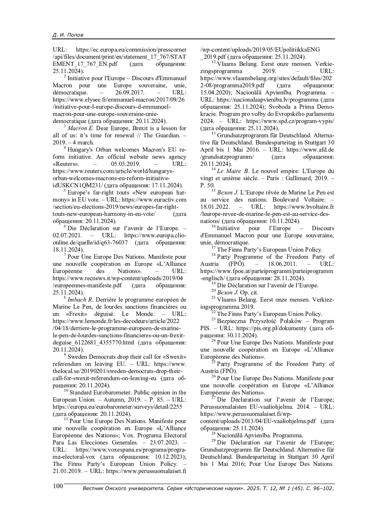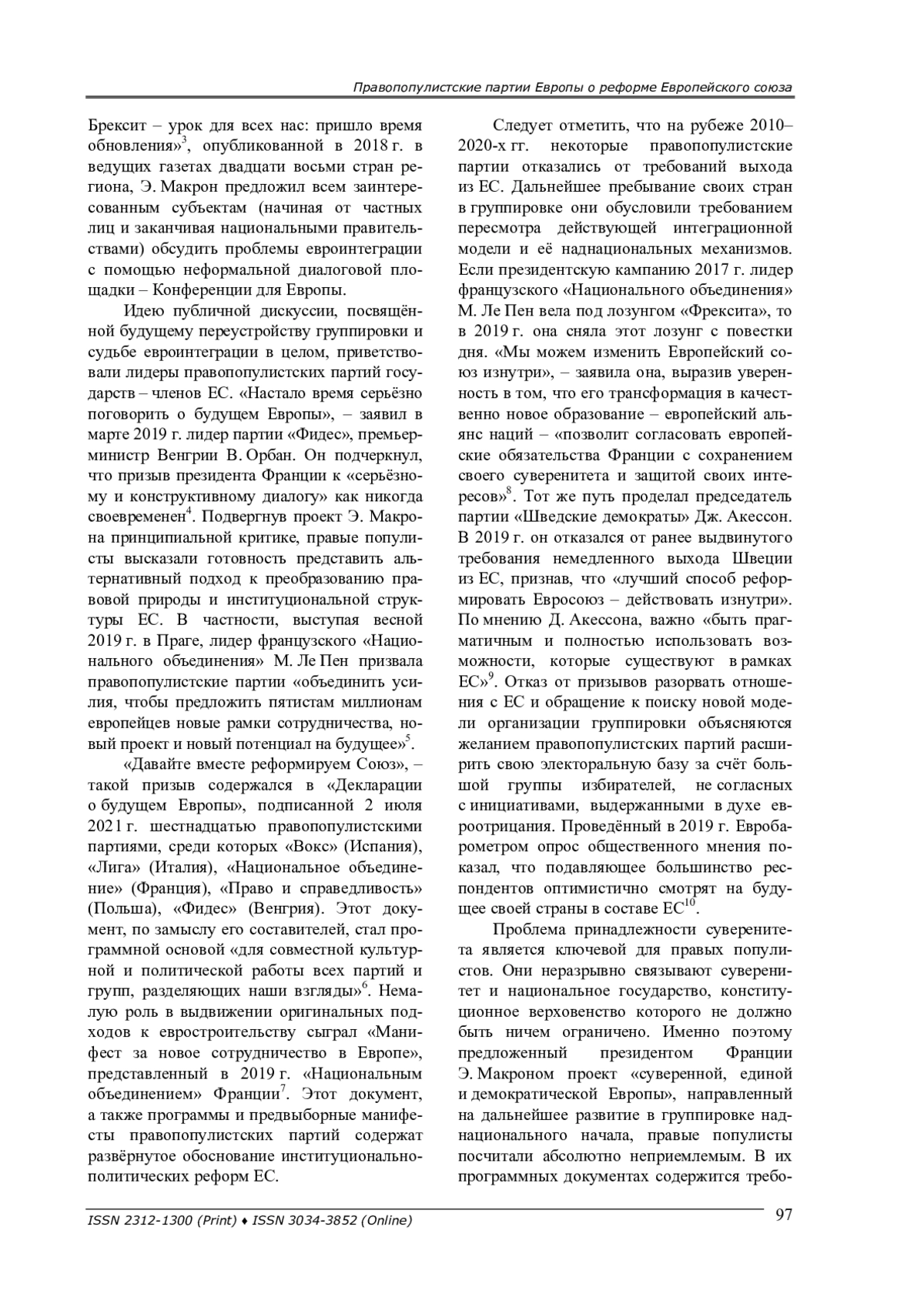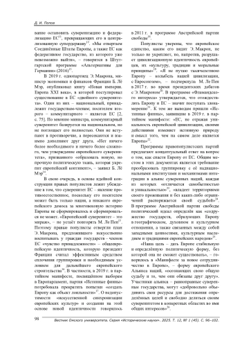 2. Фёдоров С. М. “Европейский проект” Макрона: четыре года спустя (французские планы и реалии Евросоюза) // Современная Европа. - 2021. - № 5 (105). - С. 68-78. -. DOI: 10.15211/soveurope520216878 EDN: SWVIYB