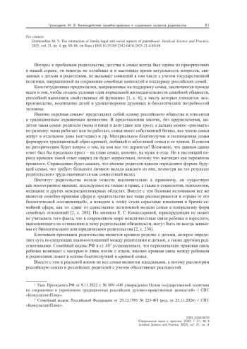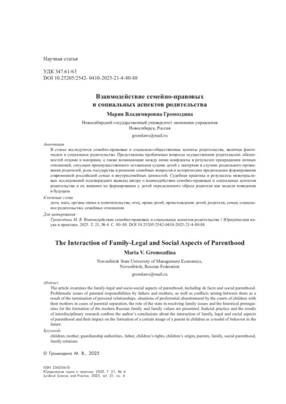 В статье исследуются семейно-правовые и социально-общественные аспекты родительства, включая фактическое и социальное родительство. Представлены проблемные вопросы осуществления родительских обязанностей отцами и матерями, а также возникающие между ними конфликты в результате прекращения личных отношений, ситуации преимущественного оставления судами детей с матерями в случаях раздельного проживания родителей, роль государства в решении семейных вопросов и исторические предпосылки формирования современной российской семьи и внутрисемейных ценностей. Судебная практика и результаты межотраслевых исследований подтверждают выводы автора о взаимодействии семейно-правовых и социальных аспектов родительства и их влиянии на формирование у детей определенного образа родителя как модели поведения в будущем.