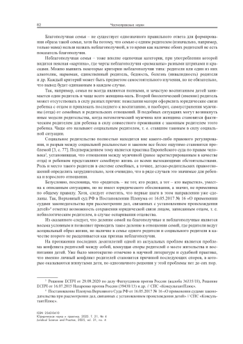Социальное родительство полностью находится вне какого-либо правового регулирования, и разрыв между социальной реальностью и законом все более ощутимо становится проблемой [3, с. 77]. Подтверждением тому является практика Европейского суда по правам человека3, установившая, что отношения между мужчиной (ранее зарегистрированным в качестве отца) и ребенком представляют семейную жизнь со всеми вытекающими обстоятельствами. Роль и место такого родителя в системе семейных, а точнее, детско-родительских правоотношений определить затруднительно, хотя очевидно, что в ряде случаев это значимые для ребенка и взрослого отношения.