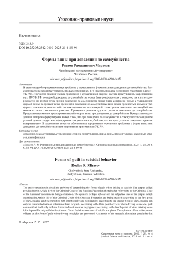 В статье подробно рассматривается проблема с определением форм вины при доведении до самоубийства. Рассматривается состав преступления, предусмотренный ст. 110 Уголовный кодекс Российской Федерации (далее – УК РФ). Изучаются мнения ученых-правоведов о субъективной стороне состава преступления, закрепленного в ст. 110 УК РФ: по первой доведение до самоубийства может быть совершено как с умыслом, так и по неосторожности; по второй точке зрения доведение до самоубийства может быть совершено только с умышленной формой вины; по третьей точке зрения при доведении до самоубийства вина может проявляться только в трех формах: косвенном умысле либо по неосторожности; по четвертой точки зрения доведение до самоубийства возможно лишь с косвенным умыслом. Приводятся решения судов по делам о доведении до самоубийства. Представляется мнения правоприменителей о форме вины при доведении до самоубийства. В результате исследования автором сформулирован вывод о том, что при доведении до самоубийства в совокупности с созданием условий деяние следует квалифицировать как умышленное убийство, так как преступление совершено «руками потерпевшего». В заключение вносится обоснованное предложение о решении проблемы о форме вины при доведении до самоубийства путем закрепления примечания в УК РФ.