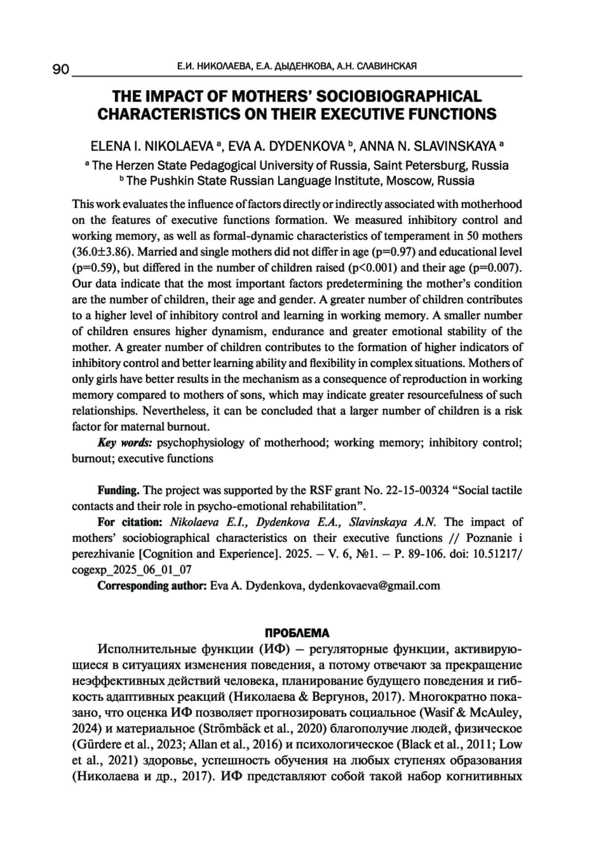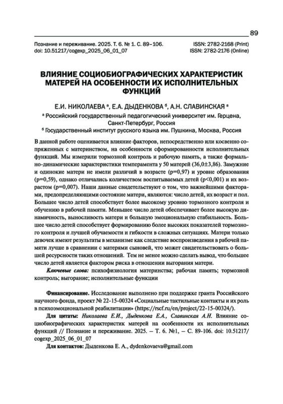 В данной работе оценивается влияние факторов, непосредственно или косвенно сопряженных с материнством, на особенности сформированности исполнительных функций. Мы измерили тормозной контроль и рабочую память, а также формально-динамические характеристики темперамента у 50 матерей (36,0±3,86). Замужние и одинокие матери не имели различий в возрасте (p=0,97) и уровне образования (p=0,59), однако отличались количеством воспитываемых детей (p<0,001) и их возрастом (p=0,007). Наши данные свидетельствуют о том, что важнейшими факторами, предопределяющими состояние матери, являются: число детей, их возраст и пол. Большее число детей способствует более высокому уровню тормозного контроля и обучению в рабочей памяти. Меньшее число детей обеспечивает более высокую динамичность, выносливость матери и большую эмоциональную стабильность. Большее число детей способствует формированию более высоких показателей тормозного контроля и лучшей обучаемости и гибкости в сложных ситуациях. Матери только девочек имеют результаты в механизме как следствие воспроизведения в рабочей памяти лучше в сравнении с матерями сыновей, что может свидетельствовать о большей ресурсности таких отношений. Тем не менее можно сделать вывод, что большее число детей является фактором риска в отношении выгорания матери.