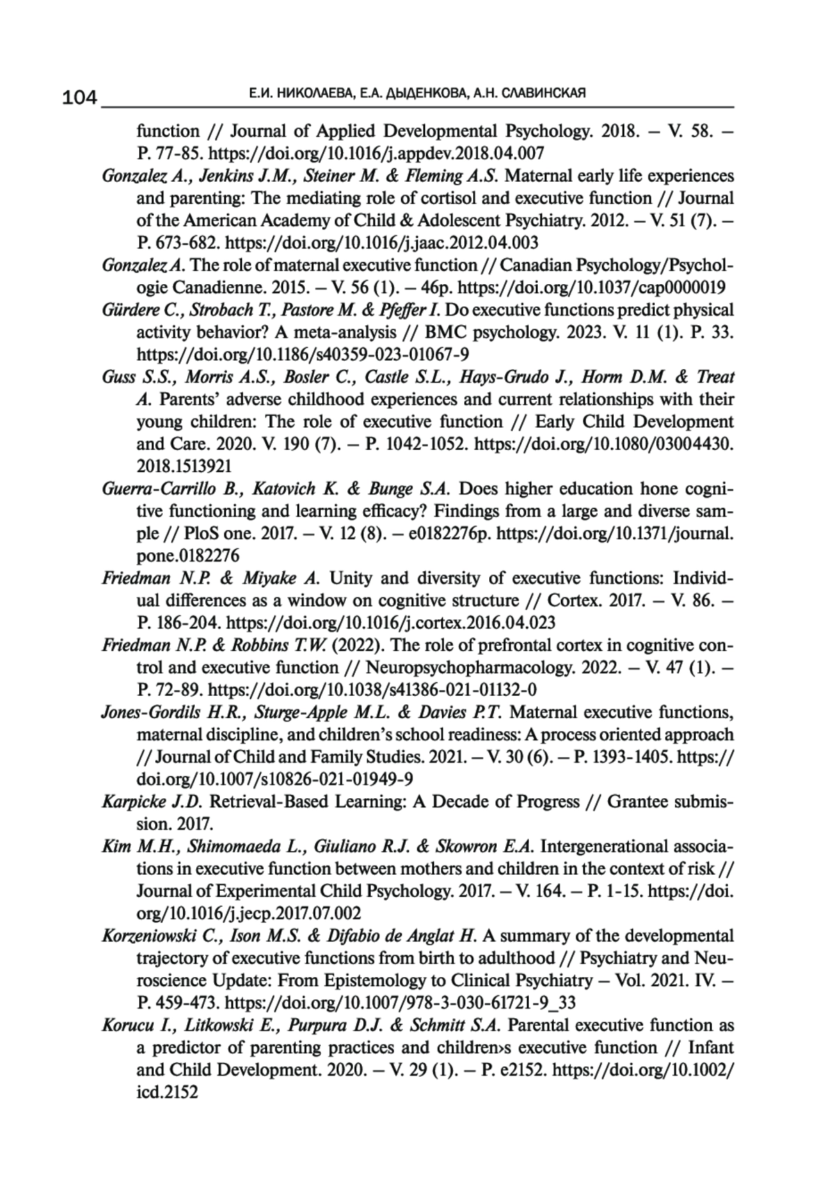 25. Jones-Gordils H.R., Sturge-Apple M.L. & Davies P.T. Maternal executive functions, maternal discipline, and children’s school readiness: A process oriented approach // Journal of Child and Family Studies. 2021. - V. 30 (6). - P. 1393-1405. DOI: 10.1007/s10826-021-01949-9