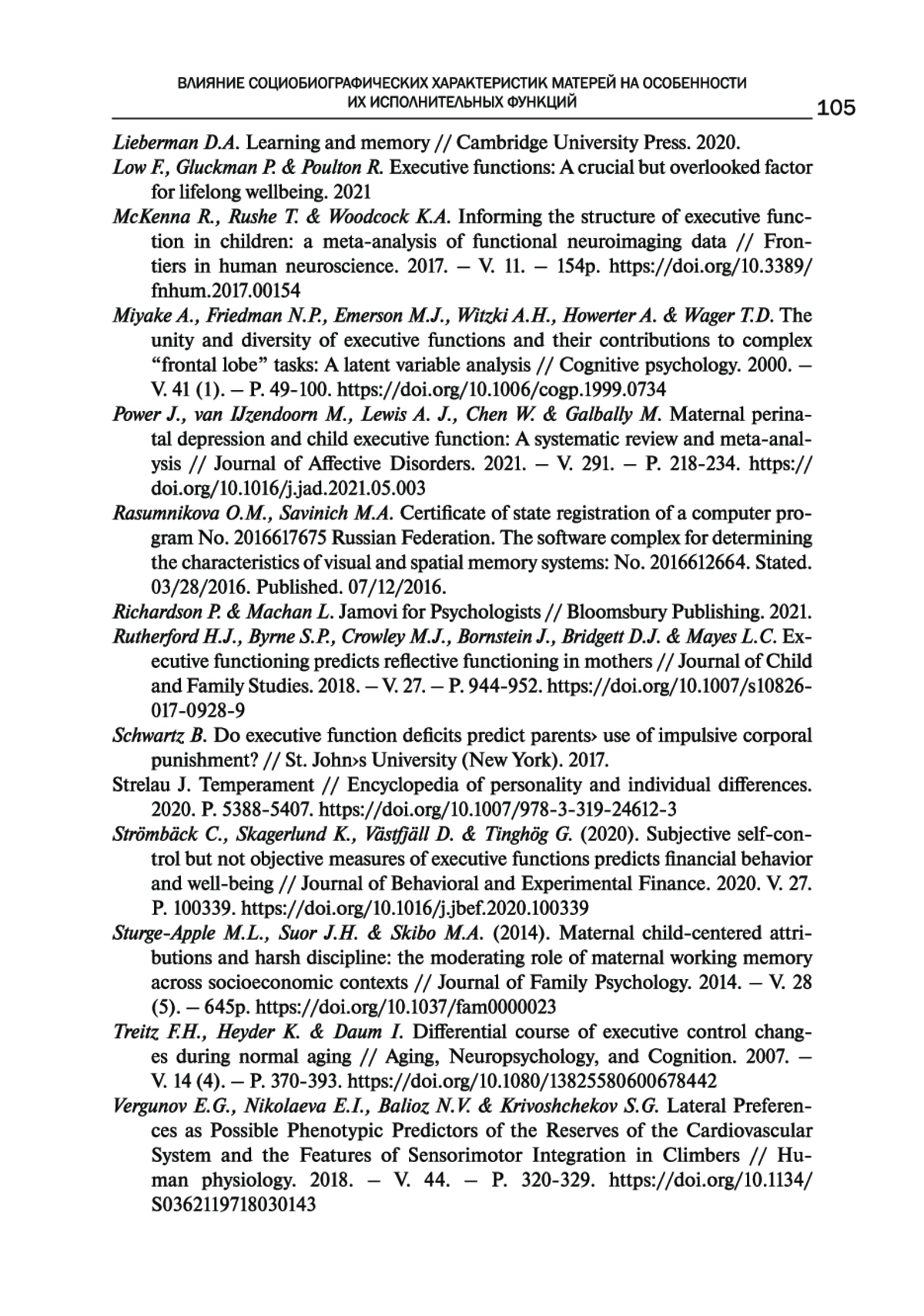 10. Bridgett D.J., Kanya M.J., Rutherford H.J. & Mayes L.C. Maternal executive functioning as a mechanism in the intergenerational transmission of parenting: Preliminary evidence // Journal of Family Psychology. 2017. - V. 31(1). - 19p.