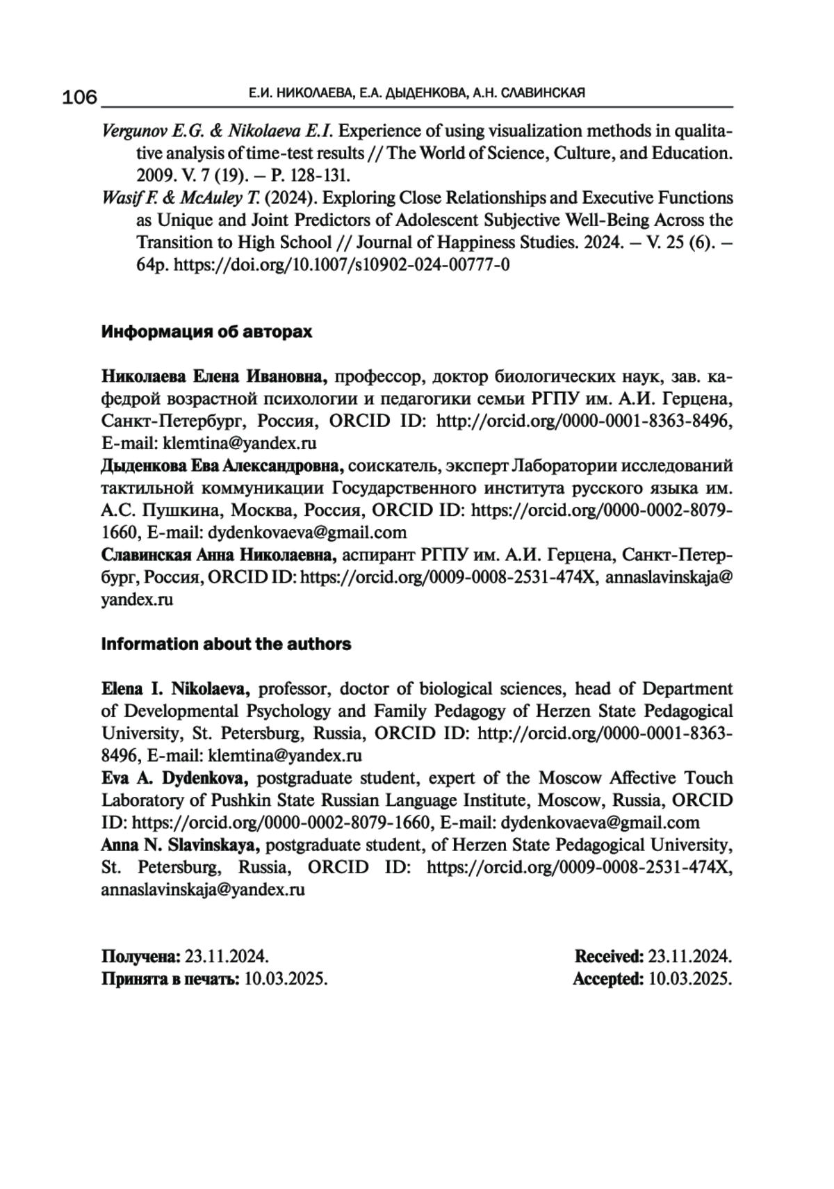 45. Wasif F. & McAuley T. (2024). Exploring Close Relationships and Executive Functions as Unique and Joint Predictors of Adolescent Subjective Well-Being Across the Transition to High School // Journal of Happiness Studies. 2024. - V. 25 (6). - 64p.
