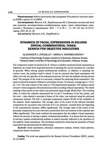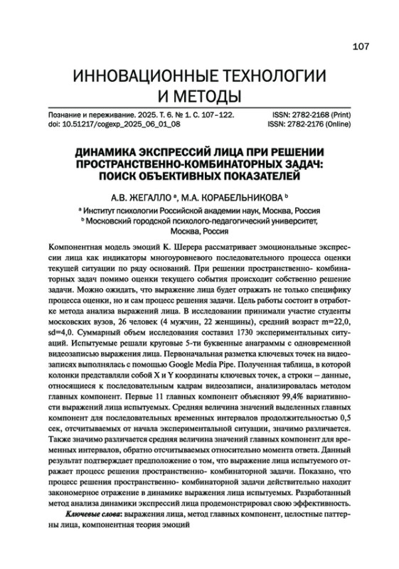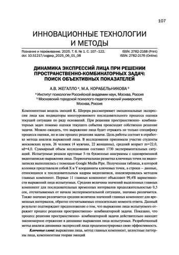 Компонентная модель эмоций К. Шерера рассматривает эмоциональные экспрессии лица как индикаторы многоуровневого последовательного процесса оценки текущей ситуации по ряду оснований. При решении пространственно- комбинаторных задач помимо оценки текущего события происходит собственно решение задачи. Можно ожидать, что выражение лица будет отражать не только специфику процесса оценки, но и сам процесс решения задачи. Цель работы состоит в отработке метода анализа выражений лица. В исследовании принимали участие студенты московских вузов, 26 человек (4 мужчин, 22 женщины), средний возраст m=22,0, sd=4,0. Суммарный объем исследования составил 1730 экспериментальных ситуаций. Испытуемые решали круговые 5-ти буквенные анаграммы с одновременной видеозаписью выражения лица. Первоначальная разметка ключевых точек на видеозаписях выполнялась с помощью Google Media Pipe. Полученная таблица, в которой колонки представляли собой X и Y координаты ключевых точек, а строки - данные, относящиеся к последовательным кадрам видеозаписи, анализировалась методом главных компонент. Первые 11 главных компонент объясняют 99,4% вариативности выражений лица испытуемых. Средняя величина значений выделенных главных компонент для последовательных временных интервалов продолжительностью 0,5 сек, отсчитываемых от начала экспериментальной ситуации, значимо различается. Также значимо различается средняя величина значений главных компонент для временных интервалов, обратно отсчитываемых относительно момента ответа. Данный результат подтверждает предположение о том, что выражение лица испытуемого отражает процесс решения пространственно- комбинаторной задачи. Показано, что процесс решения пространственно- комбинаторной задачи действительно находит закономерное отражение в динамике выражения лица испытуемых. Разработанный метод анализа динамики экспрессий лица продемонстрировал свою эффективность.