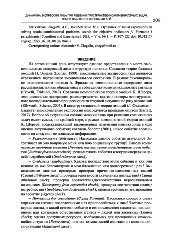 На сегодняшний день отсутствуют единые представления о месте эмо циональных экспрессий лица в структуре психики. Согласно теории базовых эмоций П. Экмана (Ekman, 1999), эмоциональные экспрессии лица являются отражением внутреннего эмоционального состояния. В рамках бихевиорально-экологического подхода А. Фридланда эмоциональные экспрессии лица рассматриваются как обращенные к собеседнику коммуникационные сигналы (Crivelli, Fridluпd, 2019). Согласно компонентной теории эмоций К. Шерера, эмоциональные экспрессии рассматриваются как индикаторы многоуровневого последовательного процесса оценки текущей ситуации по ряду оснований (Ellsworth, Scherer, 2003). В конструктивисткой теории эмоций (Л. Фельдман Барретт) эмоциональные экспрессии опосредуются прошлым опытом (Barrett, 2017). Вопрос об актуальном составе мимики лица при решении когнитивных задач имеет смысл, по крайней мере, в рамках компонентной теории эмоций К. Шерера, предсказывающей закономерные изменения мимики лица в ходе оценки актуального события; согласно Scherer (2001), новое событие соотносится со следующими классами информации.