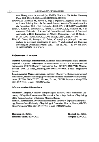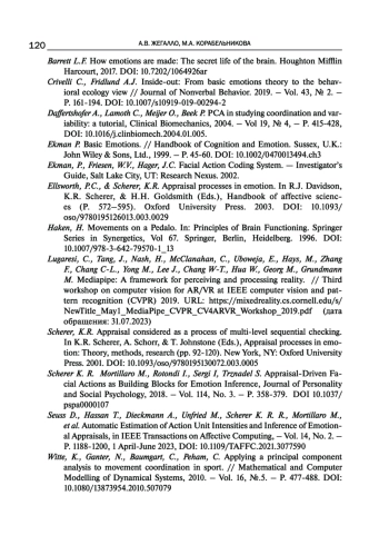 13. Scherer K. R. Mortillaro M., Rotondi I., Sergi I, Trznadel S. Appraisal-Driven Facial Actions as Building Blocks for Emotion Inference, Journal of Personality and Social Psychology, 2018. - Vol. 114, No. 3. - P. 358-379. DOI: 10.1037/pspa0000107