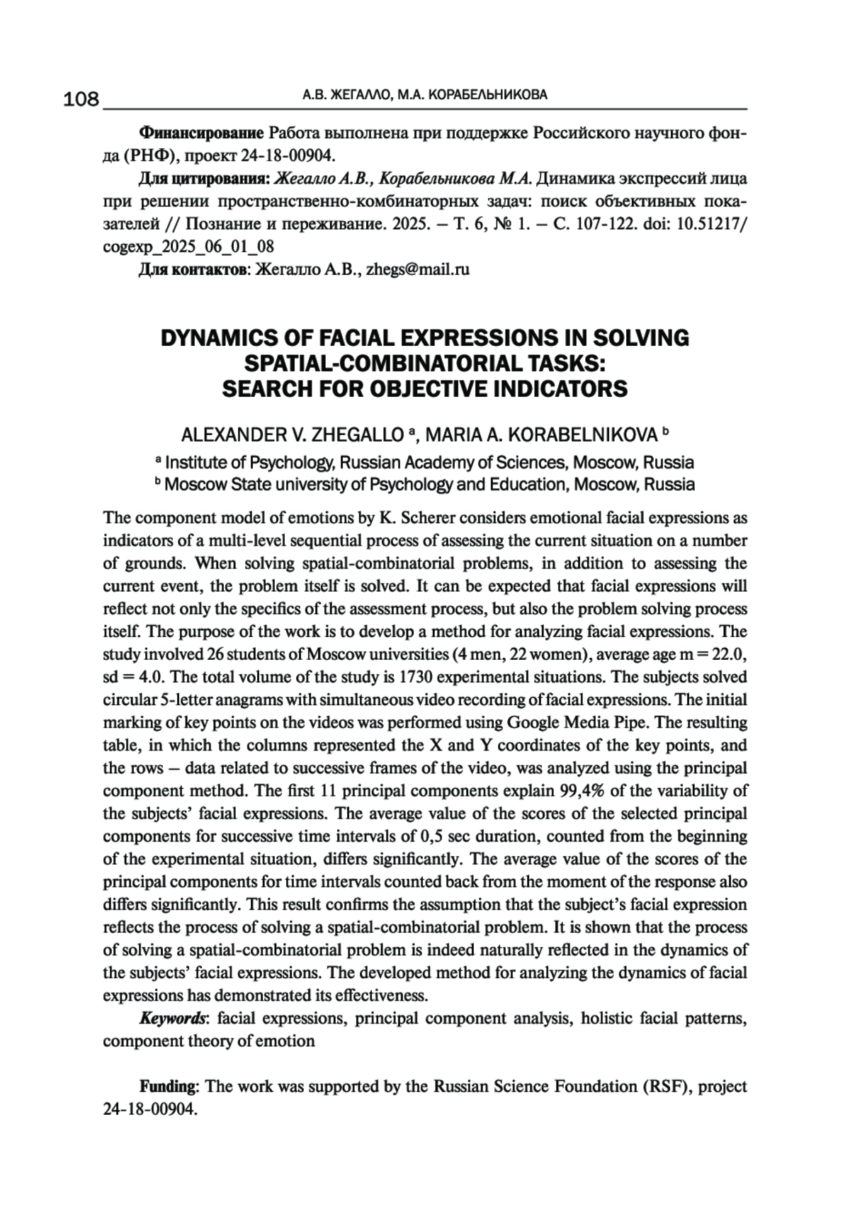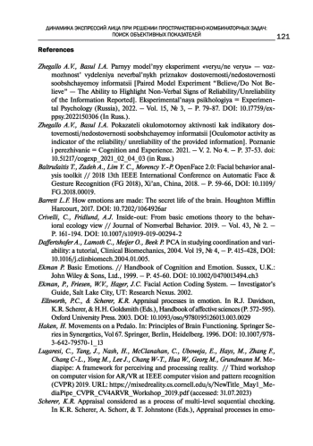 1. Жегалло А.В., Басюл И.А. Парный модельный эксперимент “верю/не верю” - возможность выделения невербальных признаков достоверности/недостоверности сообщаемой информации // Экспериментальная психология. 2022. - Т 15, № 3. - C. 79-87. DOI: 10.17759/exppsy.2022150306