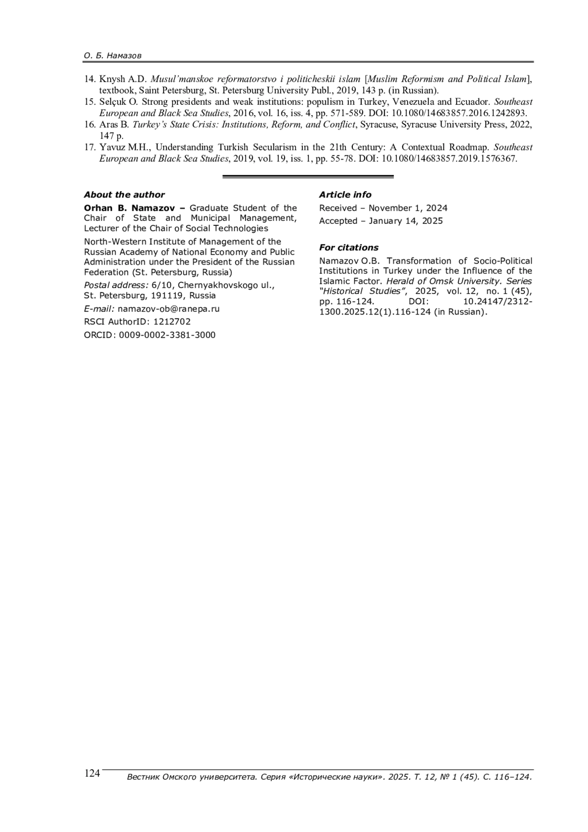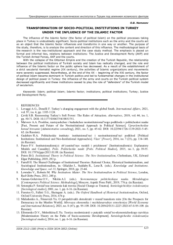 17. Yavuz M. H. Understanding Turkish Secularism in the 21th Century: A Contextual Roadmap // Southeast European and Black Sea Studies. - 2019. - Vol. 19, iss. 1. - P. 55-78. -. DOI: 10.1080/14683857.2019.1576367
