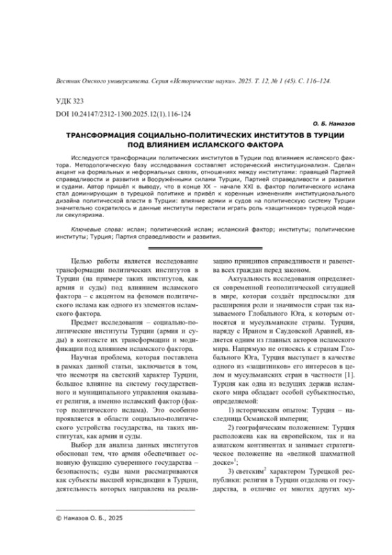 Целью работы является исследование трансформации политических институтов в Турции (на примере таких институтов, как армия и суды) под влиянием исламского фактора – с акцентом на феномен политического ислама как одного из элементов исламского фактора.