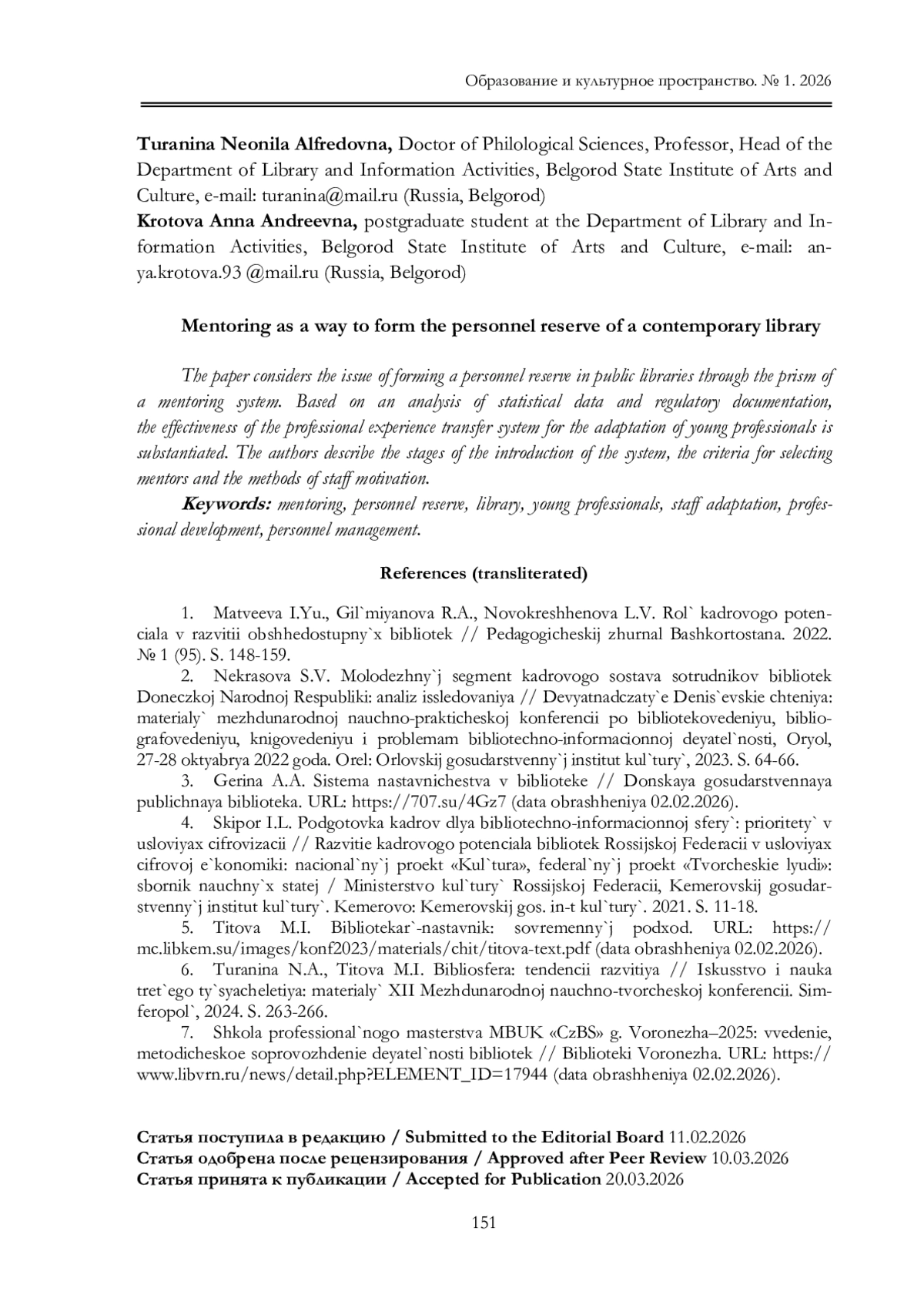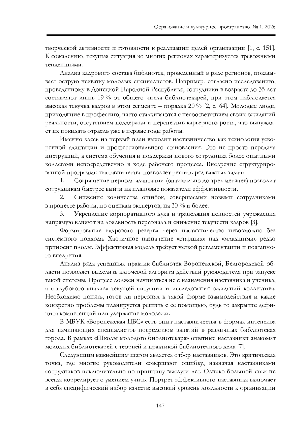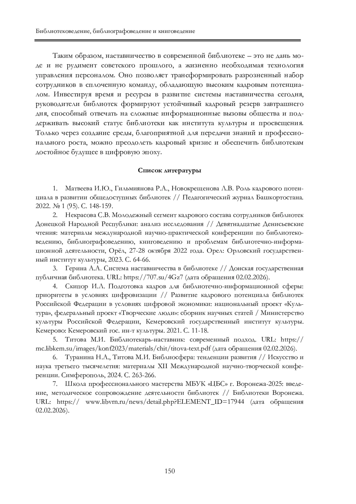 3. Герина А.А. Система наставничества в библиотеке // Донская государственная публичная библиотека. URL: https://707.su/4Gz7 (дата обращения 02.02.2026).