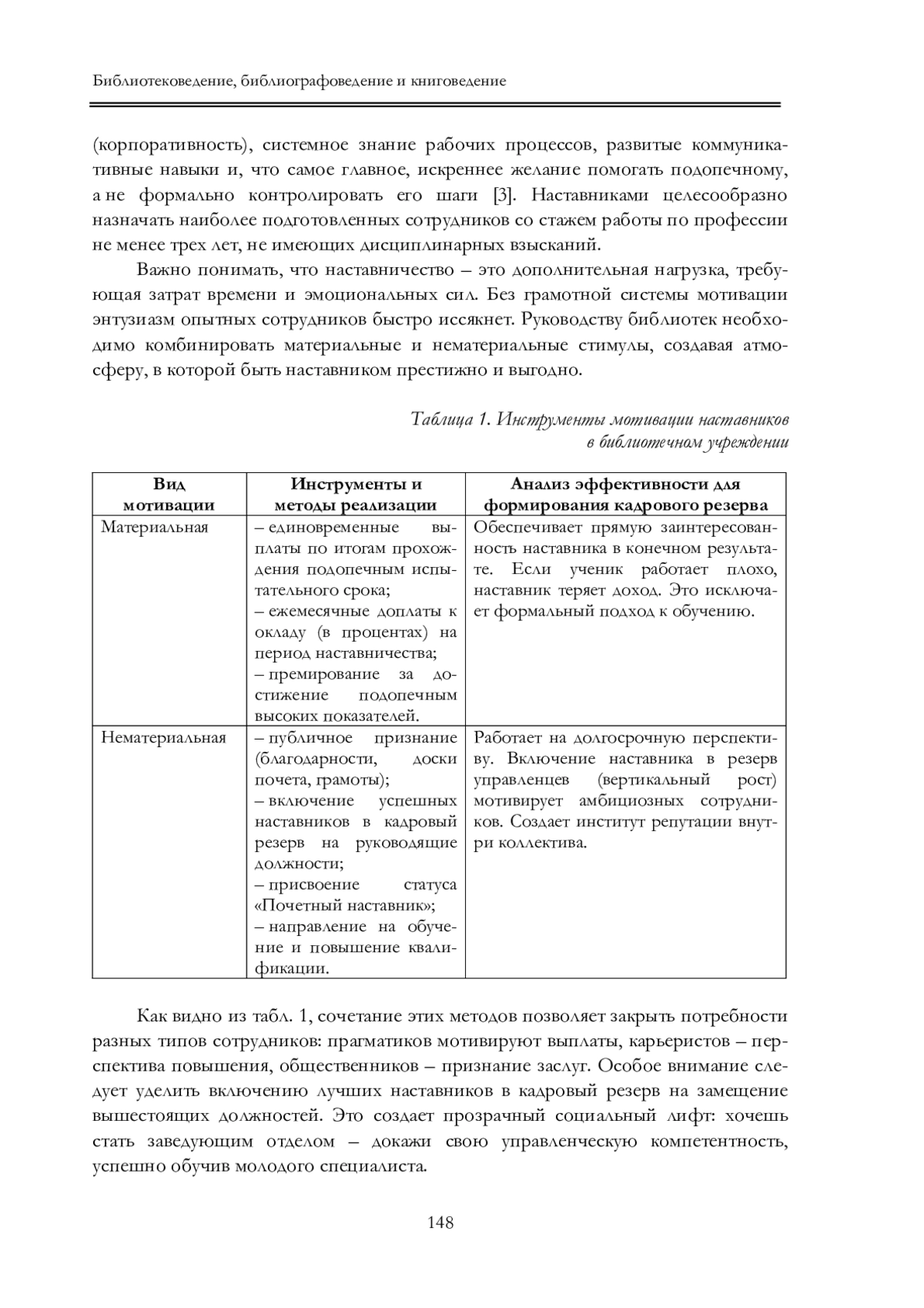 В статье рассматривается проблема формирования кадрового резерва в общедоступных библиотеках сквозь призму системы наставничества. На основе анализа статистических данных и нормативной документации обосновывается эффективность системы передачи профессионального опыта для адаптации молодых специалистов. В работе раскрываются этапы внедрения системы, критерии отбора наставников и методы мотивации персонала.
