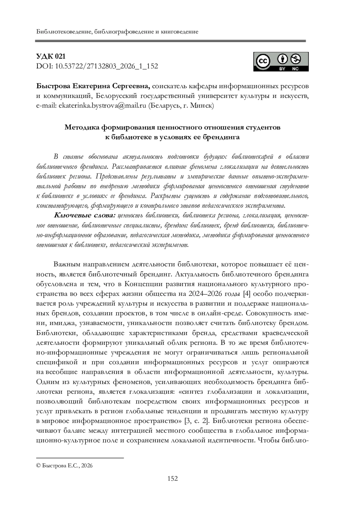 2. Быстрова Е.С. Методологические подходы к формированию ценностного от ношения студентов-библиотекарей к библиотеке как бренду в процессе образовательной деятельности / Е.С. Быстрова // Веснік Беларускага дзяржаўнага ўніверсітэта культуры і мастацтваў. 2024. № 3 (53). С. 87-96.
