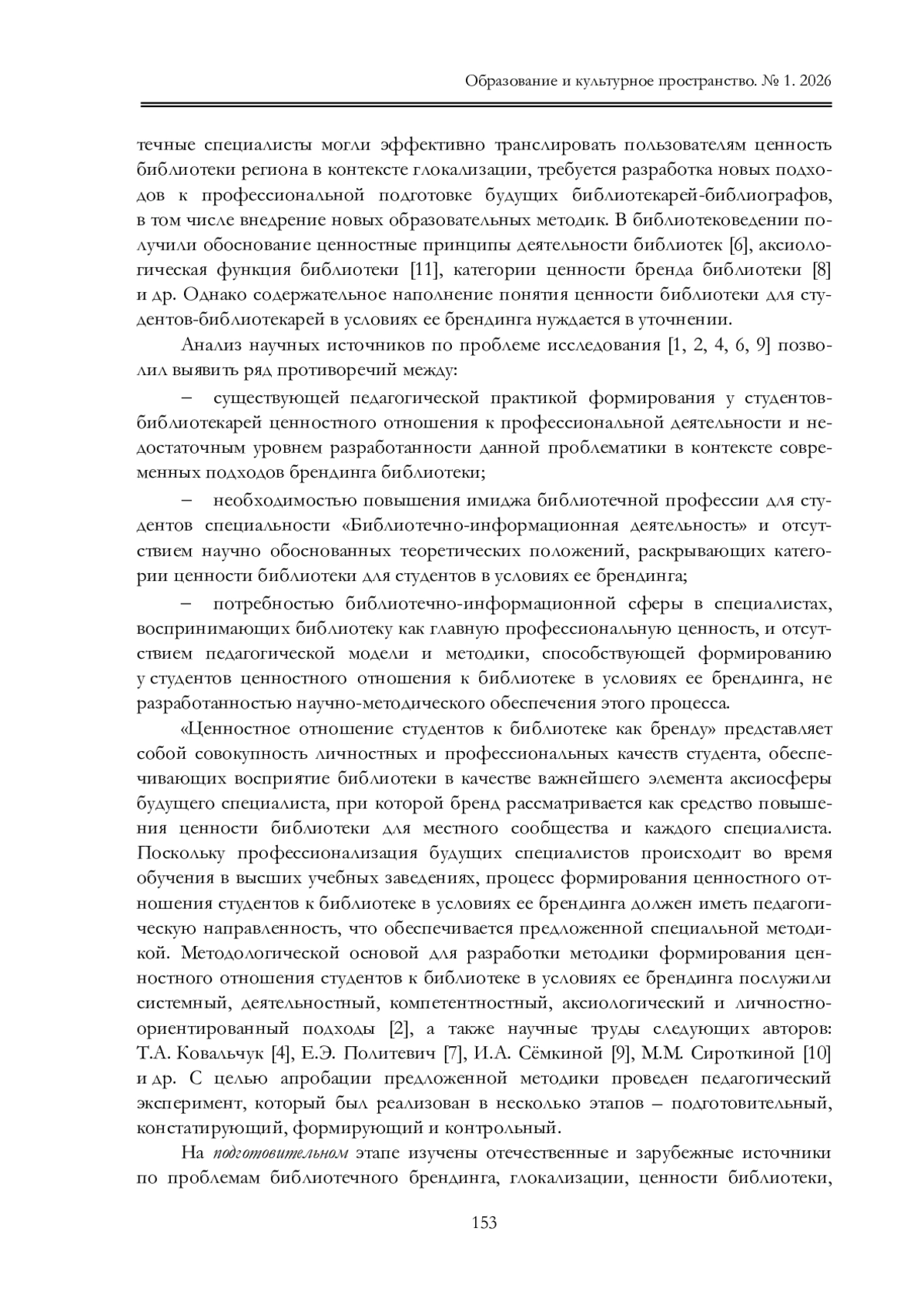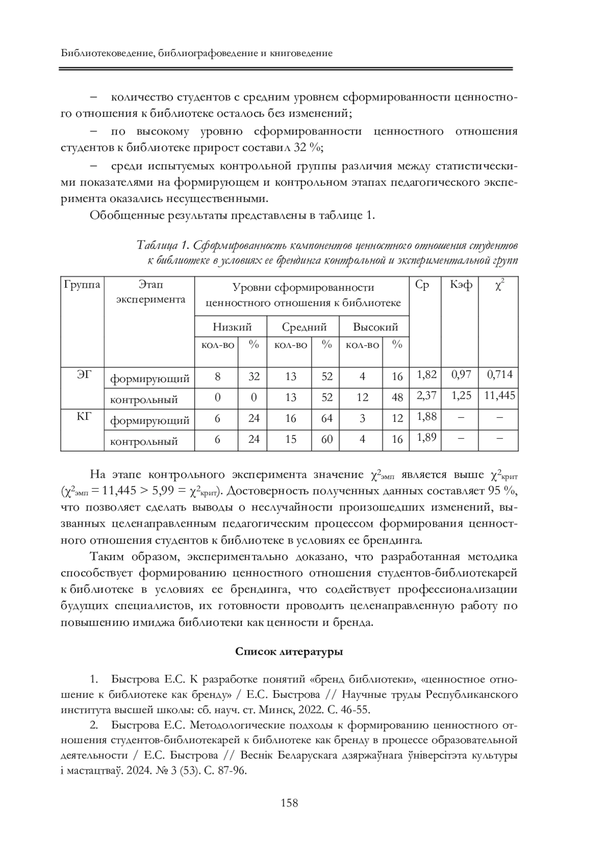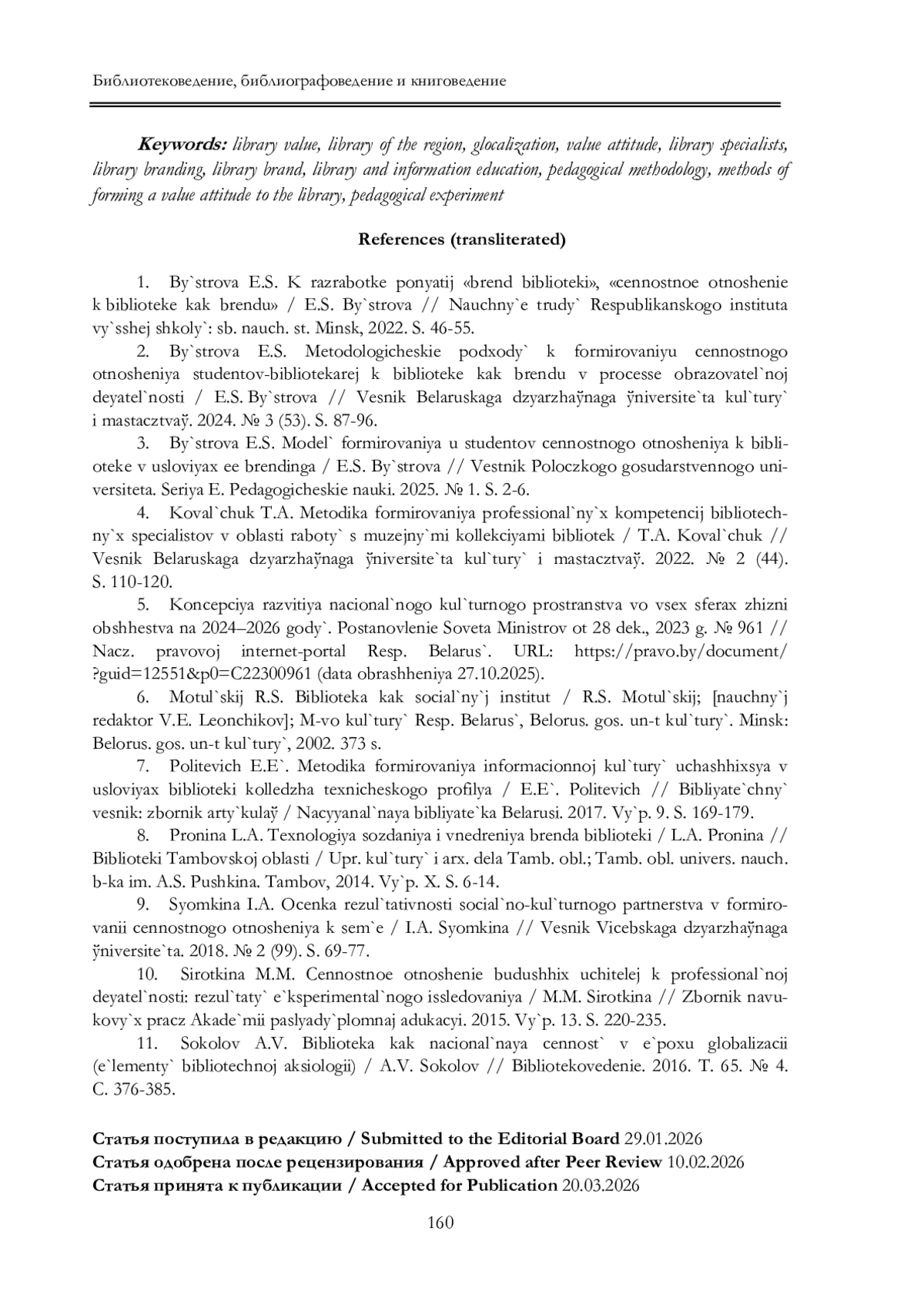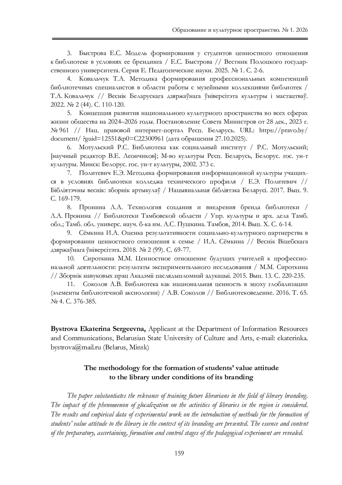 3. Быстрова Е.С. Модель формирования у студентов ценностного отношения к библиотеке в условиях ее брендинга / Е.С. Быстрова // Вестник Полоцкого государ ственного университета. Серия E. Педагогические науки. 2025. № 1. С. 2-6.
