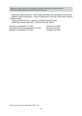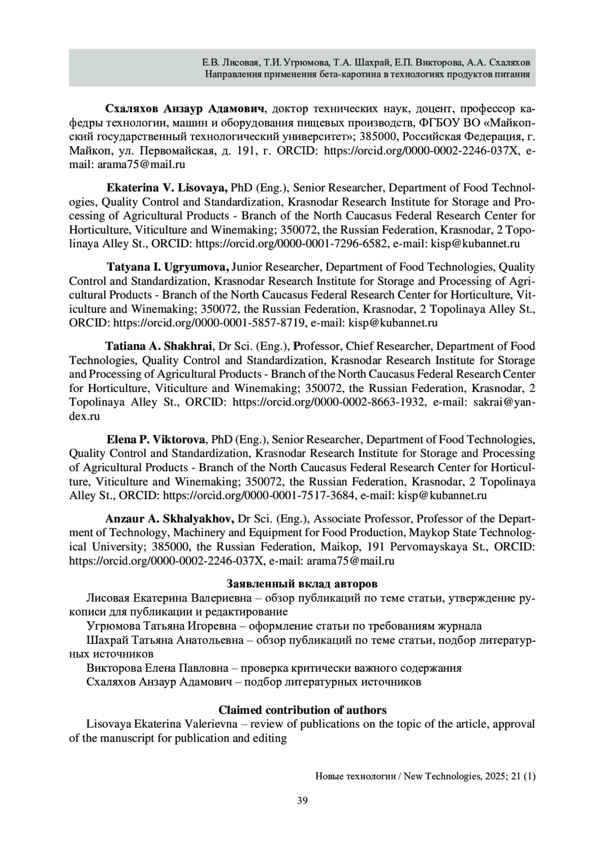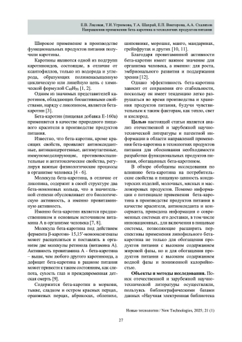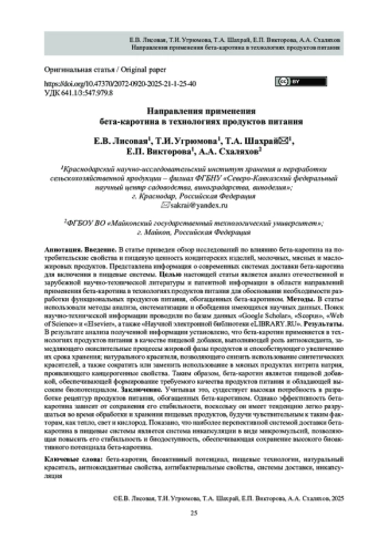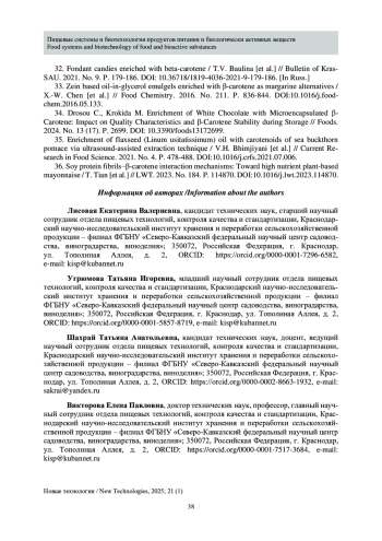 10. Nilova L.P., Potoroko I.Yu. Karotinoidy v rastitel’nykh pishchevykh sistemakh // Vestnik YuUrGU. Seriya: Pishchevye i biotekhnologii. 2021. T. 9, № 4. S. 54-69.