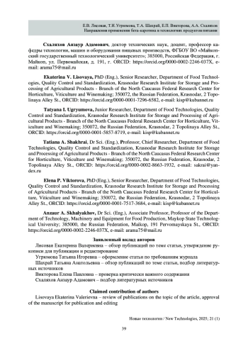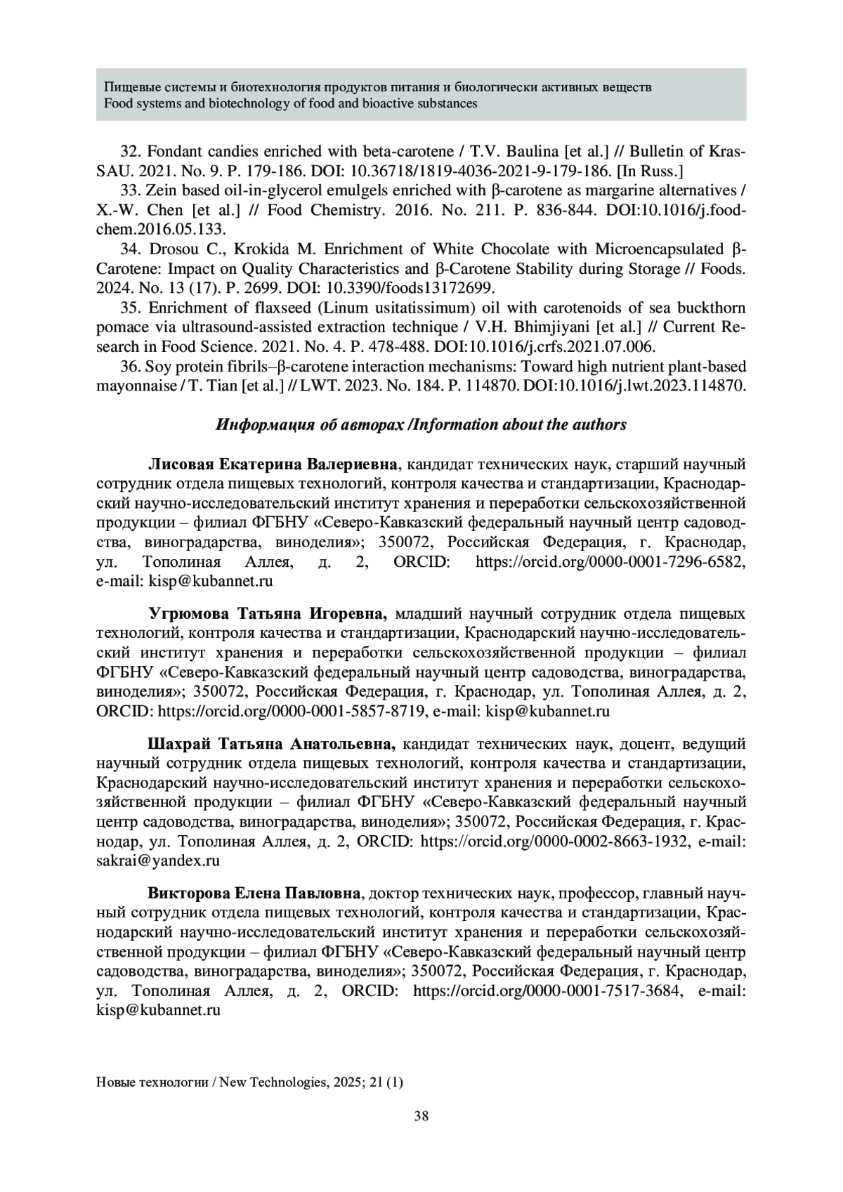 36. Soy protein fibrils-β-carotene interaction mechanisms: Toward high nutrient plant-based mayonnaise / T. Tian [et al.] // LWT. 2023. No. 184. R. 114870. https://doi.org/10.1016/j.lwt.2023.114870.
