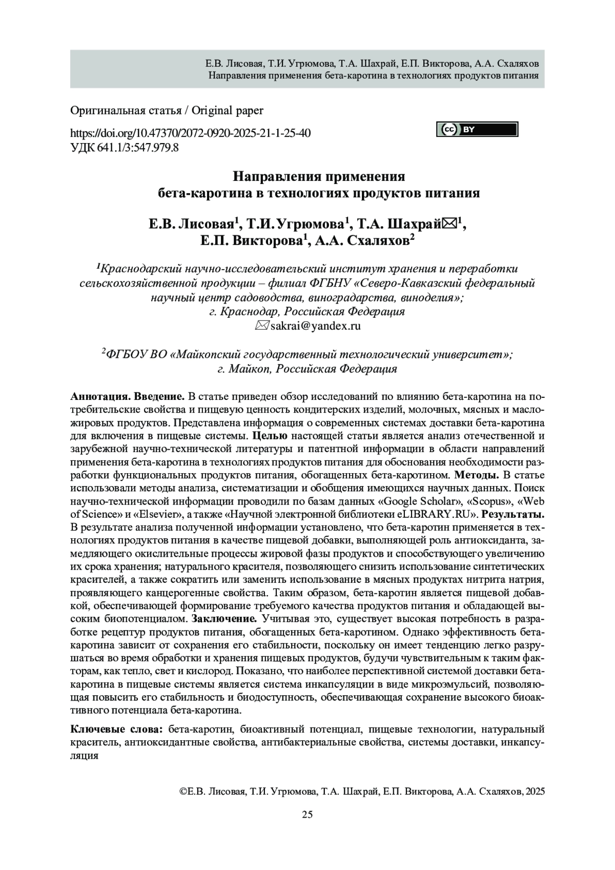 25. Bessonova L.P., Antipova L.V., Cherkasova A.V. Novaya karotinsoderzhashchaya biologicheski aktivnaya dobavka (BAD) «Tykveron» - kharakteristika i sposob polucheniya // Pishchevaya promyshlennost’. 2015. № 10. S. 23-27.