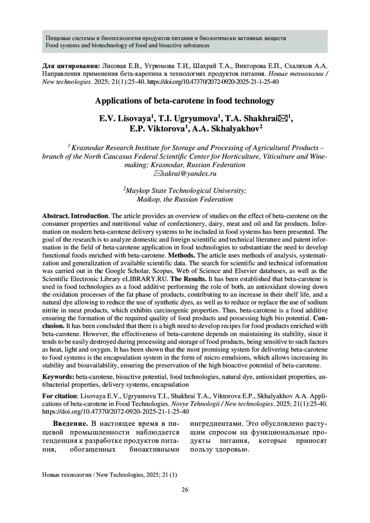 Введение. В статье приведен обзор исследований по влиянию бета-каротина на потребительские свойства и пищевую ценность кондитерских изделий, молочных, мясных и масложировых продуктов. Представлена информация о современных системах доставки бета-каротина для включения в пищевые системы. Целью настоящей статьи является анализ отечественной и зарубежной научно-технической литературы и патентной информации в области направлений применения бета-каротина в технологиях продуктов питания для обоснования необходимости разработки функциональных продуктов питания, обогащенных бета-каротином. Методы. В статье использовали методы анализа, систематизации и обобщения имеющихся научных данных. Поиск научно-технической информации проводили по базам данных «Google Scholar», «Scopus», «Web of Science» и «Elsevier», а также «Научной электронной библиотеки eLIBRARY. RU». Результаты. В результате анализа полученной информации установлено, что бета-каротин применяется в технологиях продуктов питания в качестве пищевой добавки, выполняющей роль антиоксиданта, замедляющего окислительные процессы жировой фазы продуктов и способствующего увеличению их срока хранения; натурального красителя, позволяющего снизить использование синтетических красителей, а также сократить или заменить использование в мясных продуктах нитрита натрия, проявляющего канцерогенные свойства. Таким образом, бета-каротин является пищевой добавкой, обеспечивающей формирование требуемого качества продуктов питания и обладающей высоким биопотенциалом. Заключение. Учитывая это, существует высокая потребность в разработке рецептур продуктов питания, обогащенных бета-каротином. Однако эффективность бетакаротина зависит от сохранения его стабильности, поскольку он имеет тенденцию легко разрушаться во время обработки и хранения пищевых продуктов, будучи чувствительным к таким факторам, как тепло, свет и кислород. Показано, что наиболее перспективной системой доставки бетакаротина в пищевые системы является система инкапсуляции в виде микроэмульсий, позволяющая повысить его стабильность и биодоступность, обеспечивающая сохранение высокого биоактивного потенциала бета-каротина.