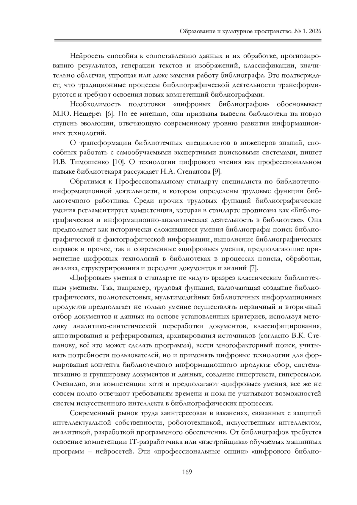 9. Стапанова Н.А. Цифровое чтение в контексте библиотечно-информационной деятельности / Н.А. Степанова // Образование и культурное пространство. 2025. № 2. С. 131-137.
