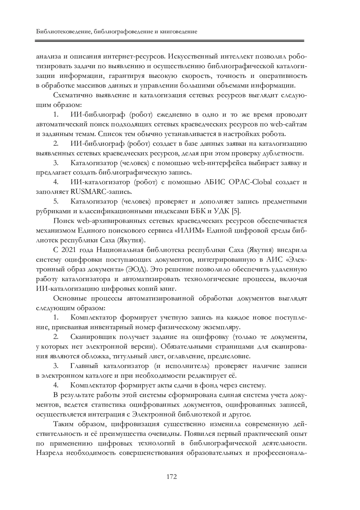 В статье рассматривается цифровая трансформация библиографической деятельности библиотек, внедрение цифровых технологий в процессы поиска, организации, обработки и предоставления библиографической информации пользователям, анализируется технология применения искусственного интеллекта в каталогизации и веб-архивировании сетевых ресурсов краеведческой направленности Национальной библиотеки республики Саха (Якутия), обосновывается необходимость формирования у «цифровых» библиографов компетенций, отвечающих современному уровню развития информационных технологий.
