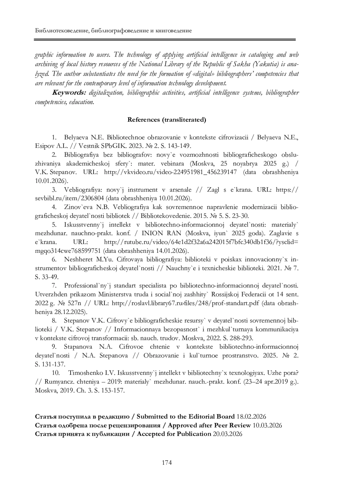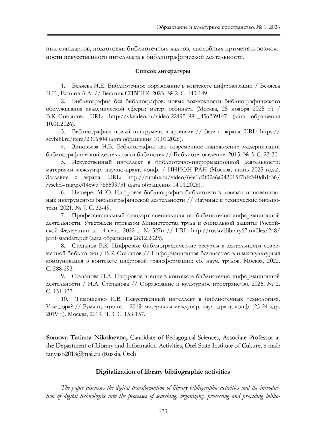 2. Библиография без библиографов: новые возможности библиографического обслуживания академической сферы: матер. вебинара (Москва, 25 ноября 2025 г.) / В.К. Степанов. URL: http://vkvideo.ru/video-224951981_456239147 (дата обращения 10.01.2026).