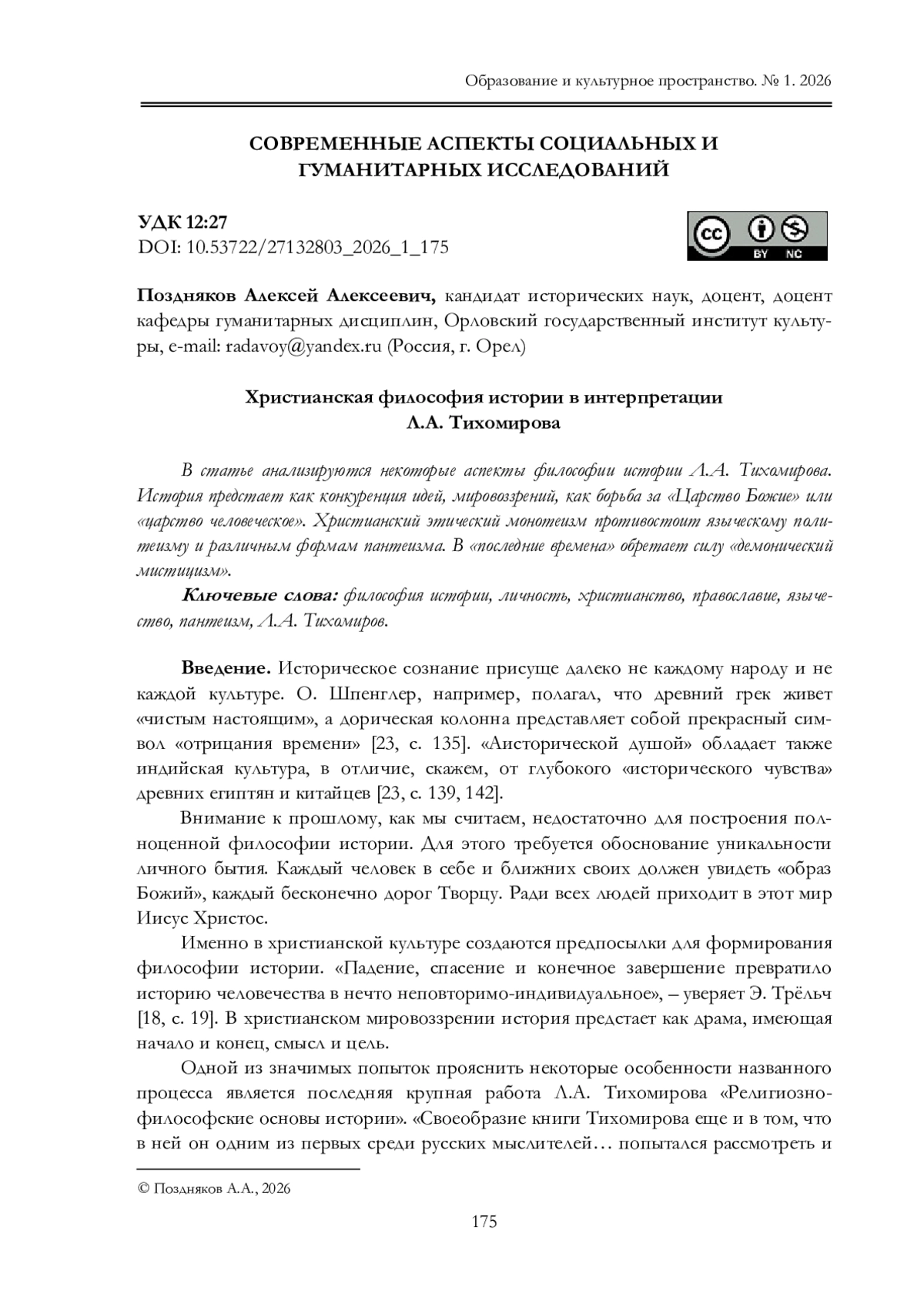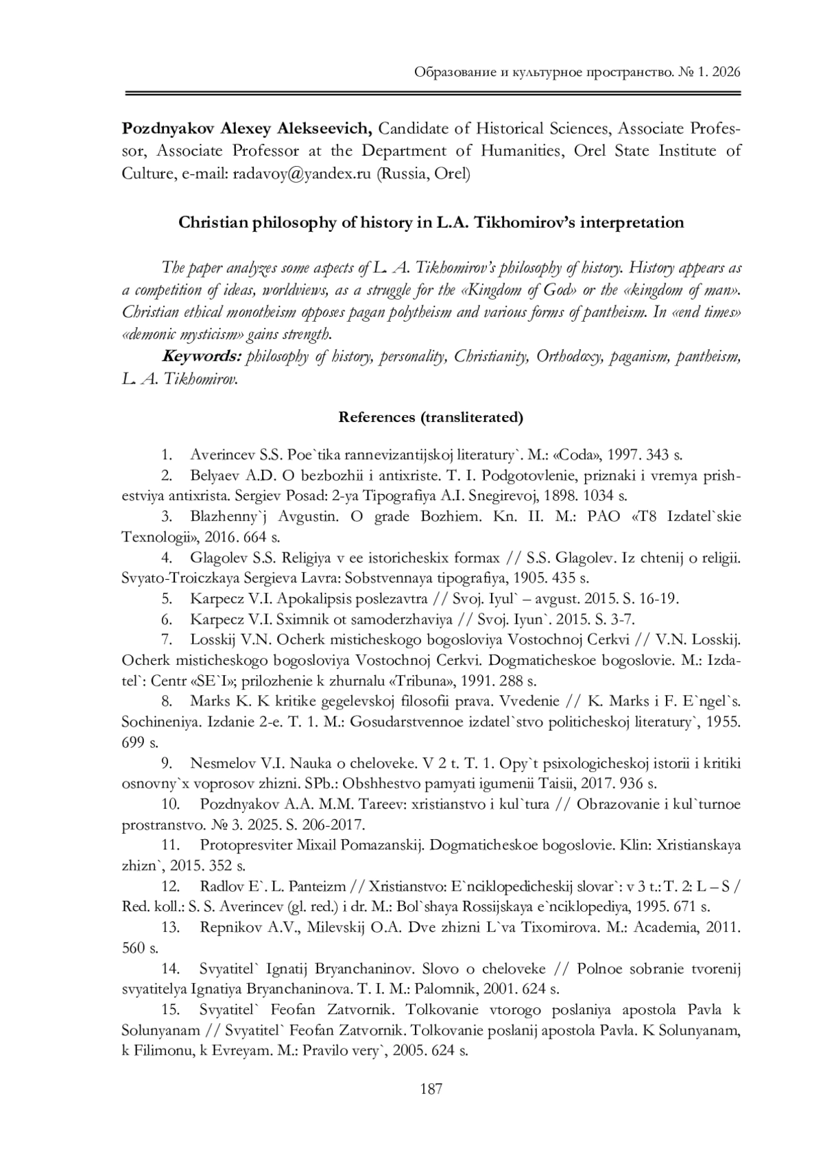 10. Поздняков А.А. М.М. Тареев: христианство и культура // Образование и культурное пространство. № 3. 2025. С. 206-2017.