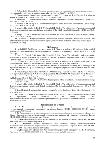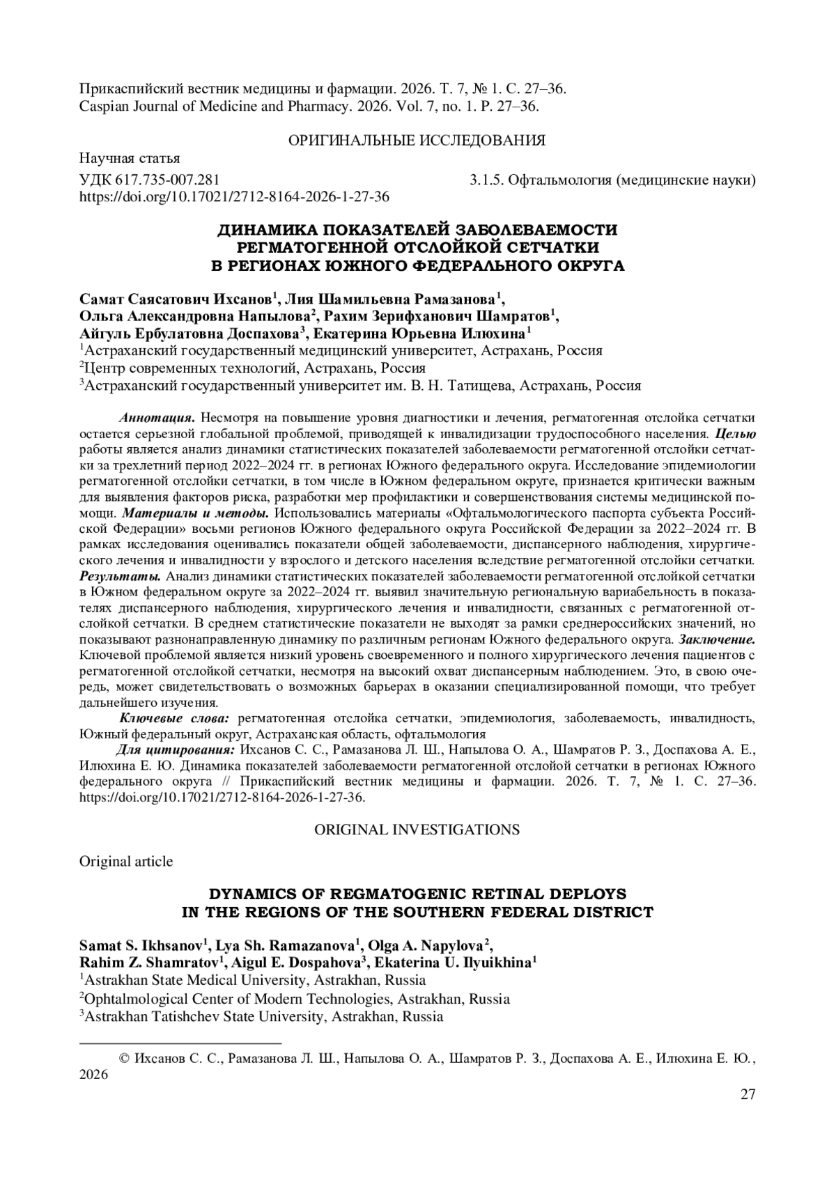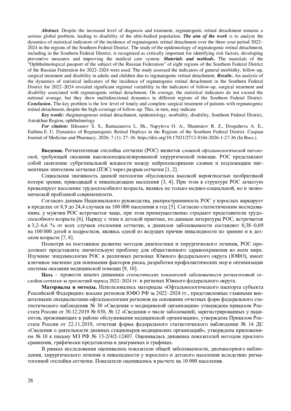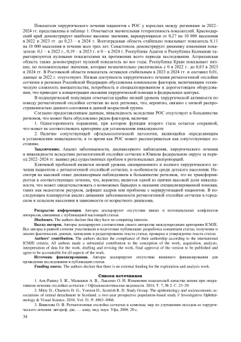 Несмотря на повышение уровня диагностики и лечения, регматогенная отслойка сетчатки остается серьезной глобальной проблемой, приводящей к инвалидизации трудоспособного населения. Целью работы является анализ динамики статистических показателей заболеваемости регматогенной отслойки сетчатки за трехлетний период 2022-2024 гг. в регионах Южного федерального округа. Исследование эпидемиологии регматогенной отслойки сетчатки, в том числе в Южном федеральном округе, признается критически важным для выявления факторов риска, разработки мер профилактики и совершенствования системы медицинской помощи. Материалы и методы. Использовались материалы «Офтальмологического паспорта субъекта Российской Федерации» восьми регионов Южного федерального округа Российской Федерации за 2022-2024 гг. В рамках исследования оценивались показатели общей заболеваемости, диспансерного наблюдения, хирургического лечения и инвалидности у взрослого и детского населения вследствие регматогенной отслойки сетчатки. Результаты. Анализ динамики статистических показателей заболеваемости регматогенной отслойкой сетчатки в Южном федеральном округе за 2022-2024 гг. выявил значительную региональную вариабельность в показателях диспансерного наблюдения, хирургического лечения и инвалидности, связанных с регматогенной отслойкой сетчатки. В среднем статистические показатели не выходят за рамки среднероссийских значений, но показывают разнонаправленную динамику по различным регионам Южного федерального округа. Заключение. Ключевой проблемой является низкий уровень своевременного и полного хирургического лечения пациентов с регматогенной отслойкой сетчатки, несмотря на высокий охват диспансерным наблюдением. Это, в свою очередь, может свидетельствовать о возможных барьерах в оказании специализированной помощи, что требует дальнейшего изучения.
