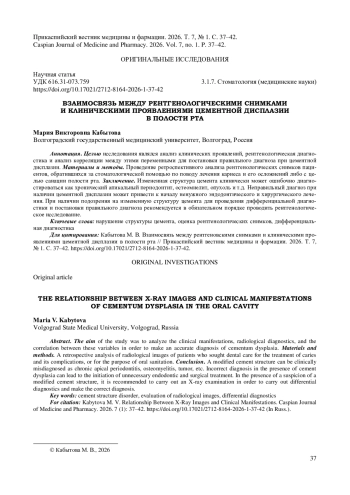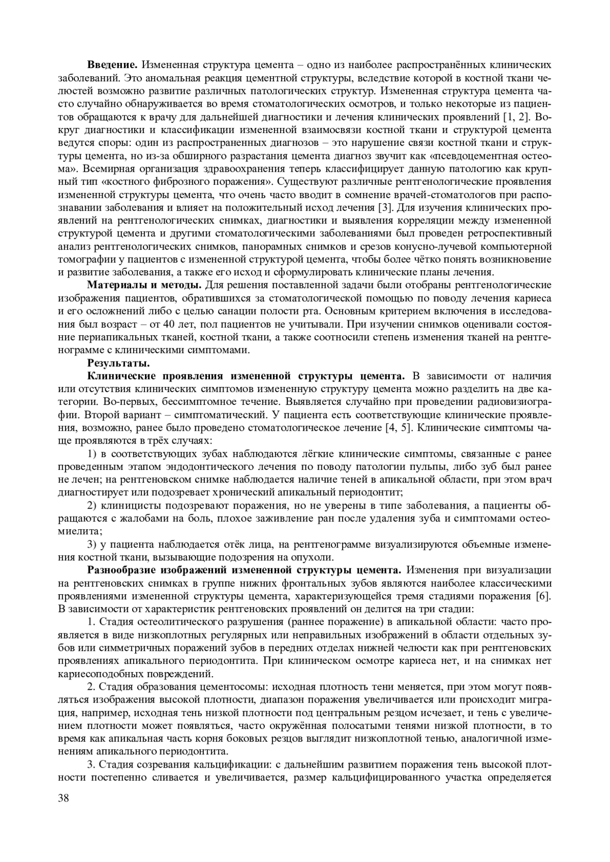 Измененная структура цемента – одно из наиболее распространённых клинических заболеваний. Это аномальная реакция цементной структуры, вследствие которой в костной ткани челюстей возможно развитие различных патологических структур. Измененная структура цемента часто случайно обнаруживается во время стоматологических осмотров, и только некоторые из пациентов обращаются к врачу для дальнейшей диагностики и лечения клинических проявлений [1, 2]. Вокруг диагностики и классификации измененной взаимосвязи костной ткани и структурой цемента ведутся споры: один из распространенных диагнозов – это нарушение связи костной ткани и структуры цемента, но из-за обширного разрастания цемента диагноз звучит как «псевдоцементная остеома». Всемирная организация здравоохранения теперь классифицирует данную патологию как крупный тип «костного фиброзного поражения». Существуют различные рентгенологические проявления измененной структуры цемента, что очень часто вводит в сомнение врачей-стоматологов при распознавании заболевания и влияет на положительный исход лечения [3]. Для изучения клинических проявлений на рентгенологических снимках, диагностики и выявления корреляции между измененной структурой цемента и другими стоматологическими заболеваниями был проведен ретроспективный анализ рентгенологических снимков, панорамных снимков и срезов конусно-лучевой компьютерной томографии у пациентов с измененной структурой цемента, чтобы более чётко понять возникновение и развитие заболевания, а также его исход и сформулировать клинические планы лечения.