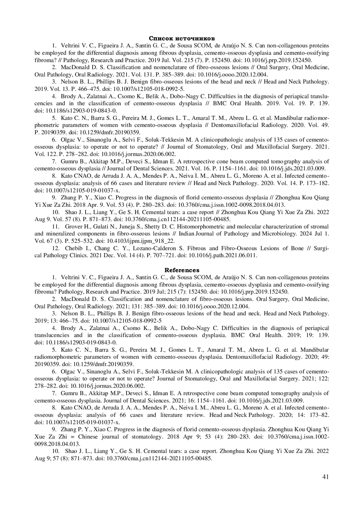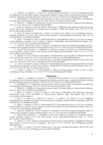 1. Veltrini V. C., Figueira J. A., Santin G. C., de Sousa SCOM, de Araújo N. S. Can non-collagenous proteins be employed for the differential diagnosis among fibrous dysplasia, cemento-osseous dysplasia and cemento-ossifying fibroma? // Pathology, Research and Practice. 2019 Jul. Vol. 215 (7). P. 152450. DOI: 10.1016/j.prp.2019.152450
