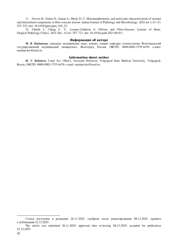 11. Grover H., Gulati N., Juneja S., Shetty D. C. Histomorphometric and molecular characterization of stromal and mineralized components in fibro-osseous lesions // Indian Journal of Pathology and Microbiology. 2024 Jul 1. Vol. 67 (3). P. 525-532. DOI: 10.4103/ijpm.ijpm_918_22
