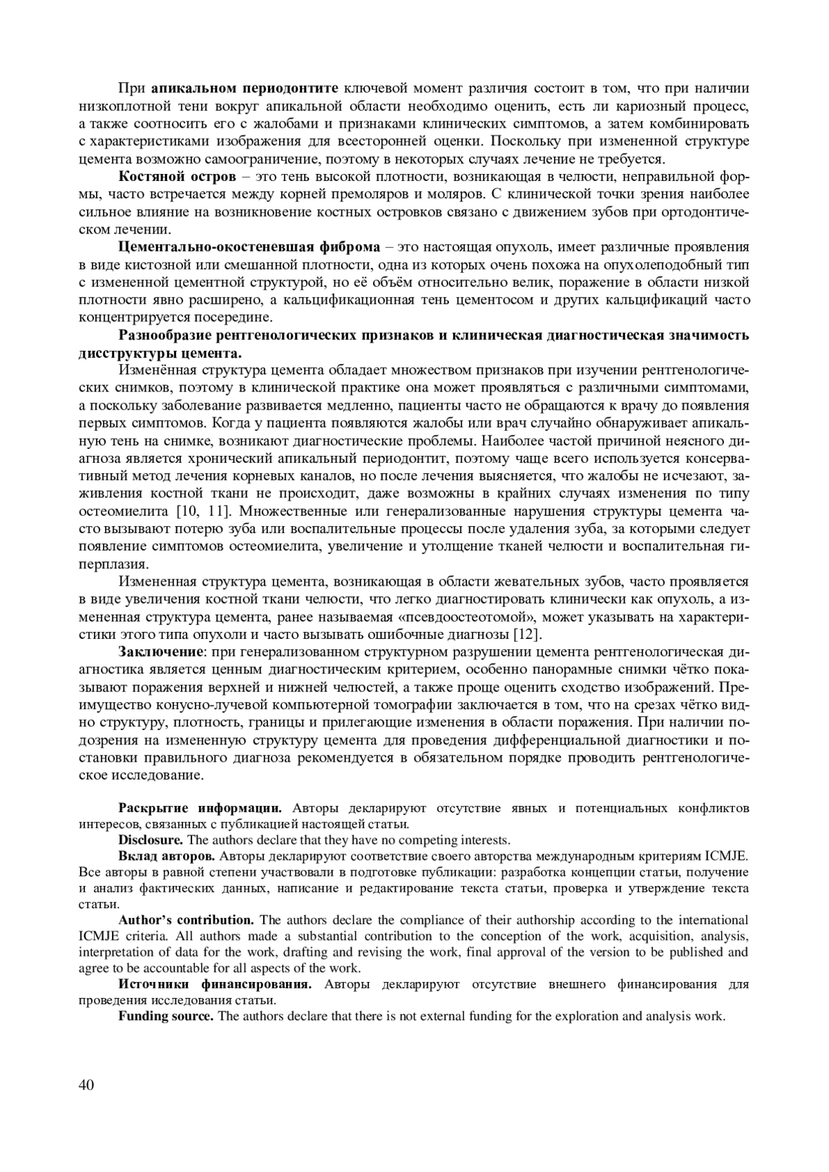 Заключение. Измененная структура цемента клинически может ошибочно диагностироваться как хронический апикальный периодонтит, остеомиелит, опухоль и т. д. Неправильный диагноз при наличии цементной дисплазии может привести к началу ненужного эндодонтического и хирургического лечения. При наличии подозрения на измененную структуру цемента для проведения дифференциальной диагностики и постановки правильного диагноза рекомендуется в обязательном порядке проводить рентгенологическое исследование.