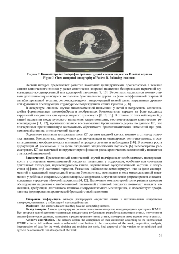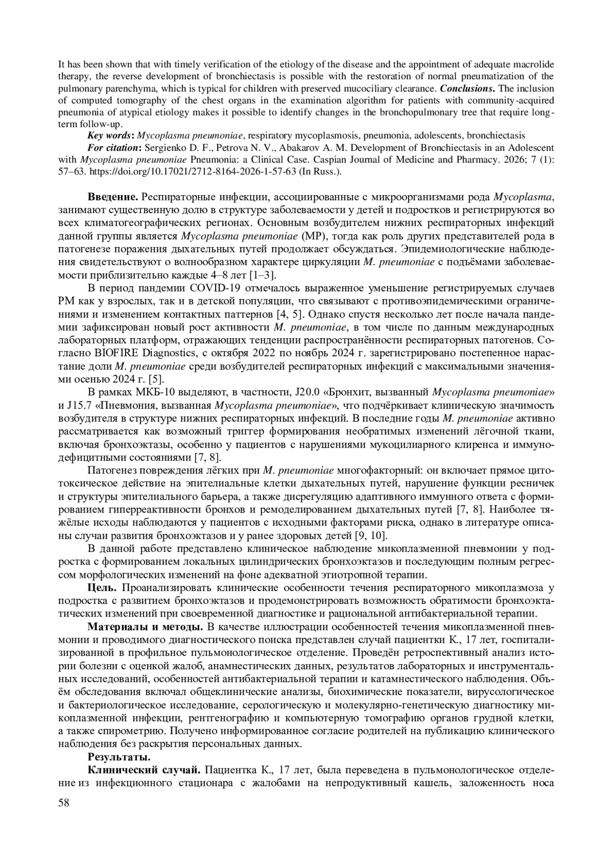 Респираторный микоплазмоз рассматривают как группу инфекционно-воспалительных заболеваний дыхательных путей, при которых ведущим этиологическим фактором является Mycoplasma pneumoniae. Данный микроорганизм относят к значимым факторам риска формирования хронической патологии лёгких у детей, включая облитерирующий бронхиолит, бронхиальную астму и бронхоэктатическую болезнь, что связано с его способностью инициировать гипериммунный ответ, повреждать эпителиальный барьер и длительно оказывать цитотоксическое влияние на элементы мукоцилиарного клиренса. Цель исследования. Представление собственного клинического наблюдения развития бронхоэктазов у подростка в исходе микоплазменной пневмонии. Методы. Проведён ретроспективный анализ истории болезни. Описан случай госпитализированной пациентки в профильное пульмонологическое отделение с микоплазменной бронхопневмонии и формированием локальных цилиндрических бронхоэктазов в сегментах S6-S8 левого лёгкого и последующим катамнестическим клинико-инструментальным наблюдением в течение 12 мес. Результаты. Показано, что при своевременной верификации этиологии заболевания и назначении адекватной макролидной терапии возможно обратное развитие бронхоэктазов с восстановлением нормальной пневматизации лёгочной паренхимы, что характерно для детей с сохранённым мукоцилиарным клиренсом. Выводы. Включение компьютерной томографии органов грудной клетки в алгоритм обследования пациентов с внебольничной пневмонией атипичной этиологии позволяет выявлять изменения бронхолёгочного дерева, требующие длительного диспансерного наблюдения.