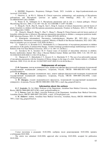 2. Преображенская Д. В., Кремплевская С. П., Музыка А. Д., Мелехина Е. В. Особенности течения респираторного микоплазмоза у детей в постковидный период // Эпидемиология и инфекционные болезни. 2023. Т. 13, № 4. С. 50-56. DOI: 10.18565/epidem.2023.13.4.50-6