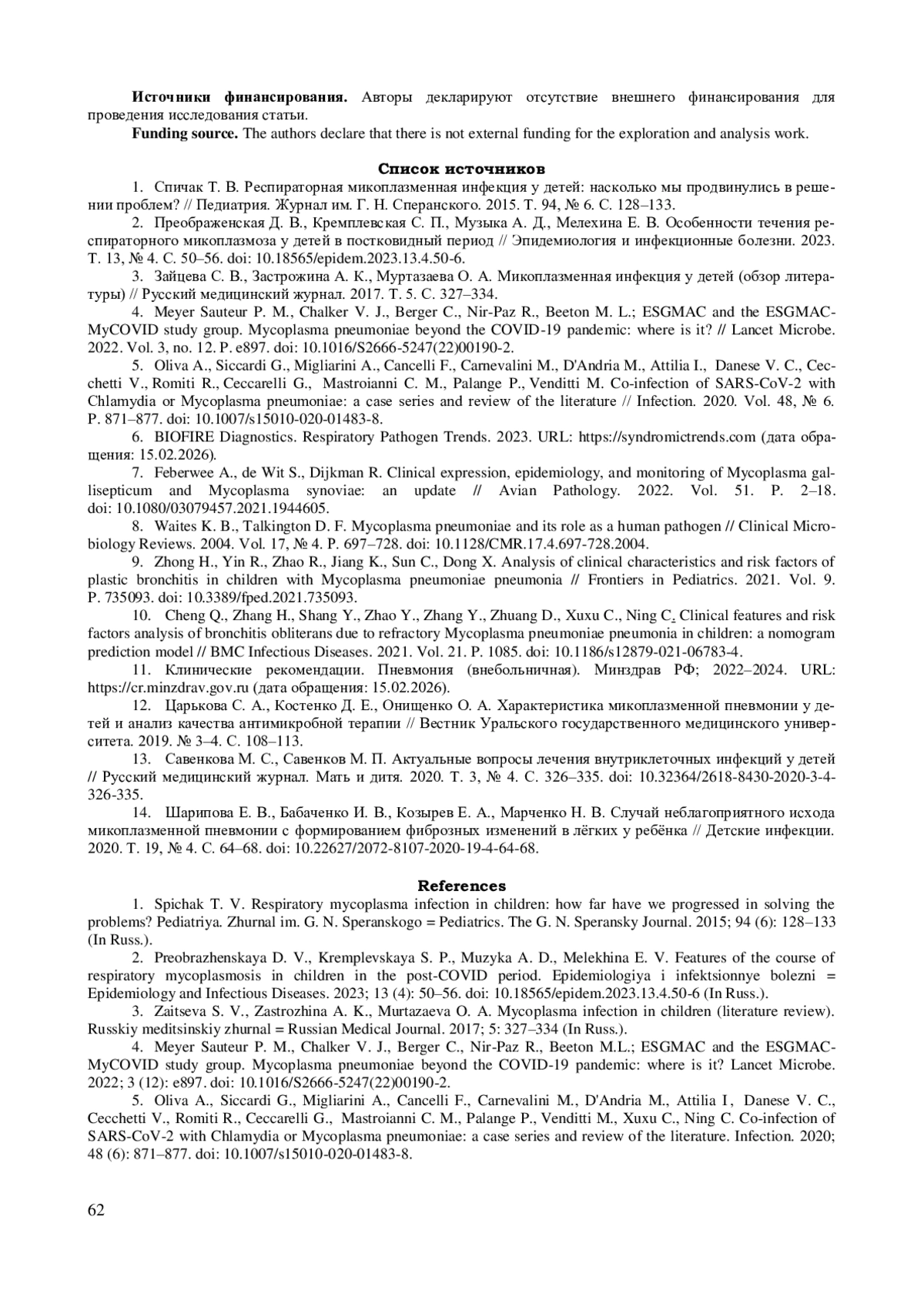 1. Спичак Т. В. Респираторная микоплазменная инфекция у детей: насколько мы продвинулись в решении проблем? // Педиатрия. Журнал им. Г. Н. Сперанского. 2015. Т. 94, № 6. С. 128-133.