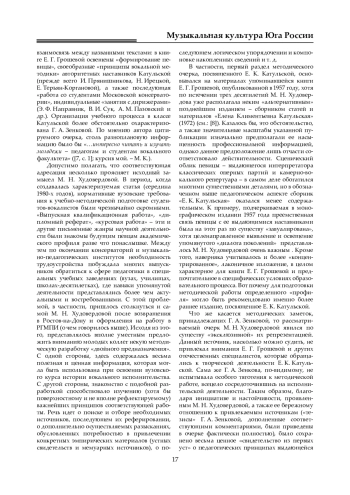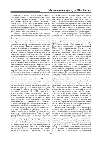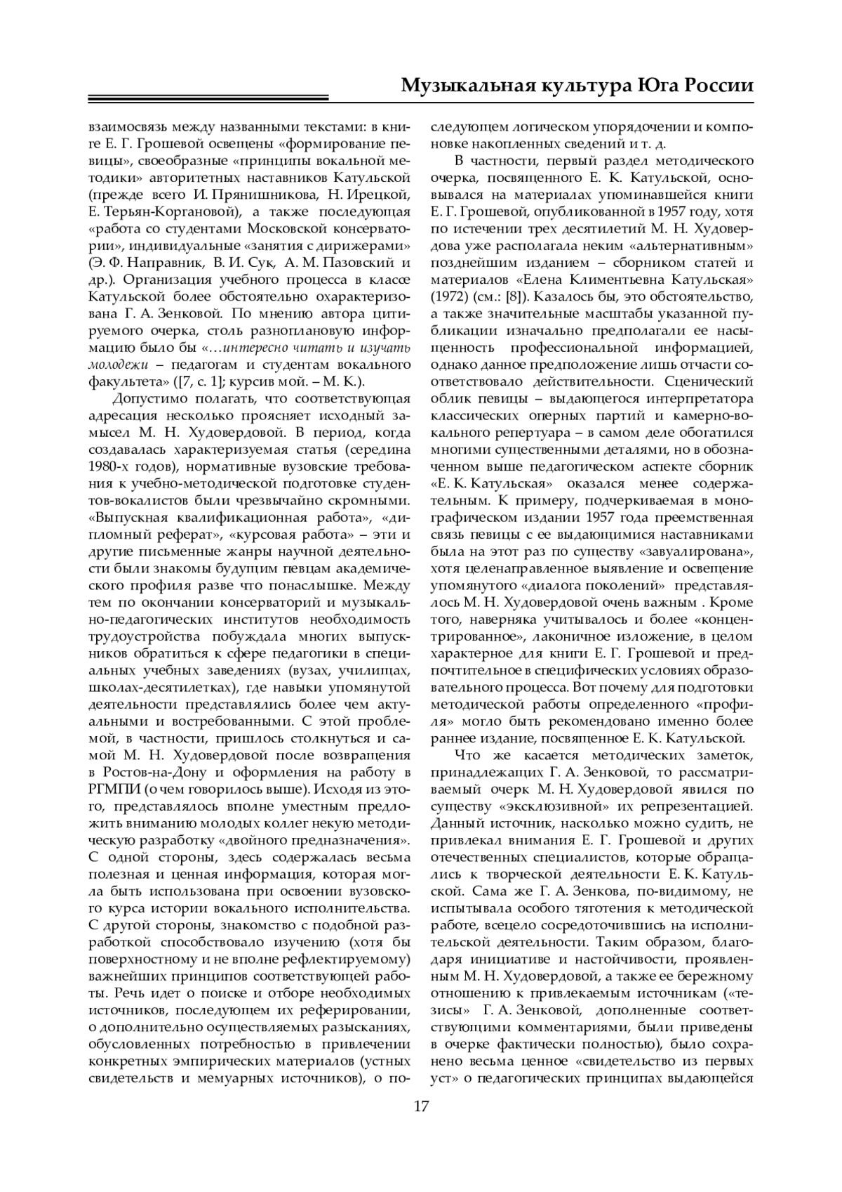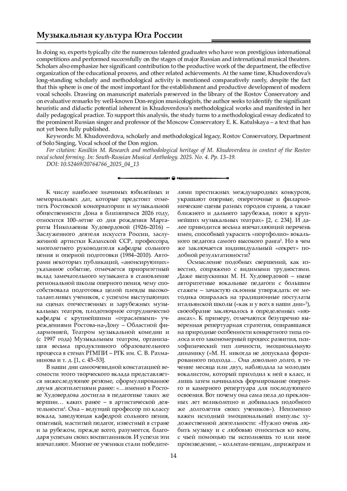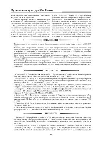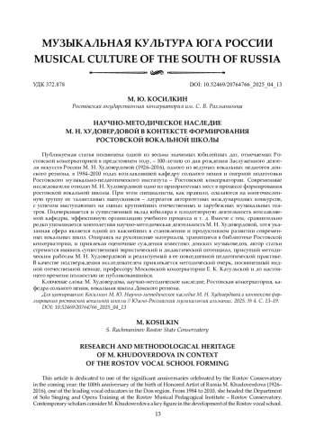 Публикуемая статья посвящена одной из весьма значимых юбилейных дат, отмечаемых Ростовской консерваторией в предстоящем году, - 100-летию со дня рождения Заслуженного деятеля искусств России М. Н. Худовердовой (1926-2016), одного из ведущих вокальных педагогов донского региона, в 1984-2010 годах возглавлявшей кафедру сольного пения и оперной подготовки Ростовского музыкально-педагогического института - Ростовской консерватории. Современные исследователи отводят М. Н. Худовердовой одно из приоритетных мест в процессе формирования ростовской вокальной школы. При этом специалисты, как правило, ссылаются на многочисленную группу ее талантливых выпускников - лауреатов авторитетных международных конкурсов, с успехом выступающих на сценах крупнейших отечественных и зарубежных музыкальных театров. Подчеркивается и существенный вклад юбиляра в плодотворную деятельность возглавляемой кафедры, эффективную организацию учебного процесса и т. д. Вместе с тем, сравнительно редко упоминается многолетняя научно-методическая деятельность М. Н. Худовердовой, хотя указанная сфера является одной из важнейших в становлении и продуктивном развитии современных вокальных школ. Опираясь на рукописные материалы, хранящиеся в библиотеке Ростовской консерватории, и привлекая оценочные суждения известных донских музыковедов, автор статьи стремится выявить существенный эвристический и дидактический потенциал, присущий методическим работам М. Н. Худовердовой и реализуемый в ее повседневной педагогической практике. В качестве подтверждения исследователем привлекается методический очерк, посвященный видной отечественной певице, профессору Московской консерватории Е. К. Катульской и до настоящего времени полностью не публиковавшийся.