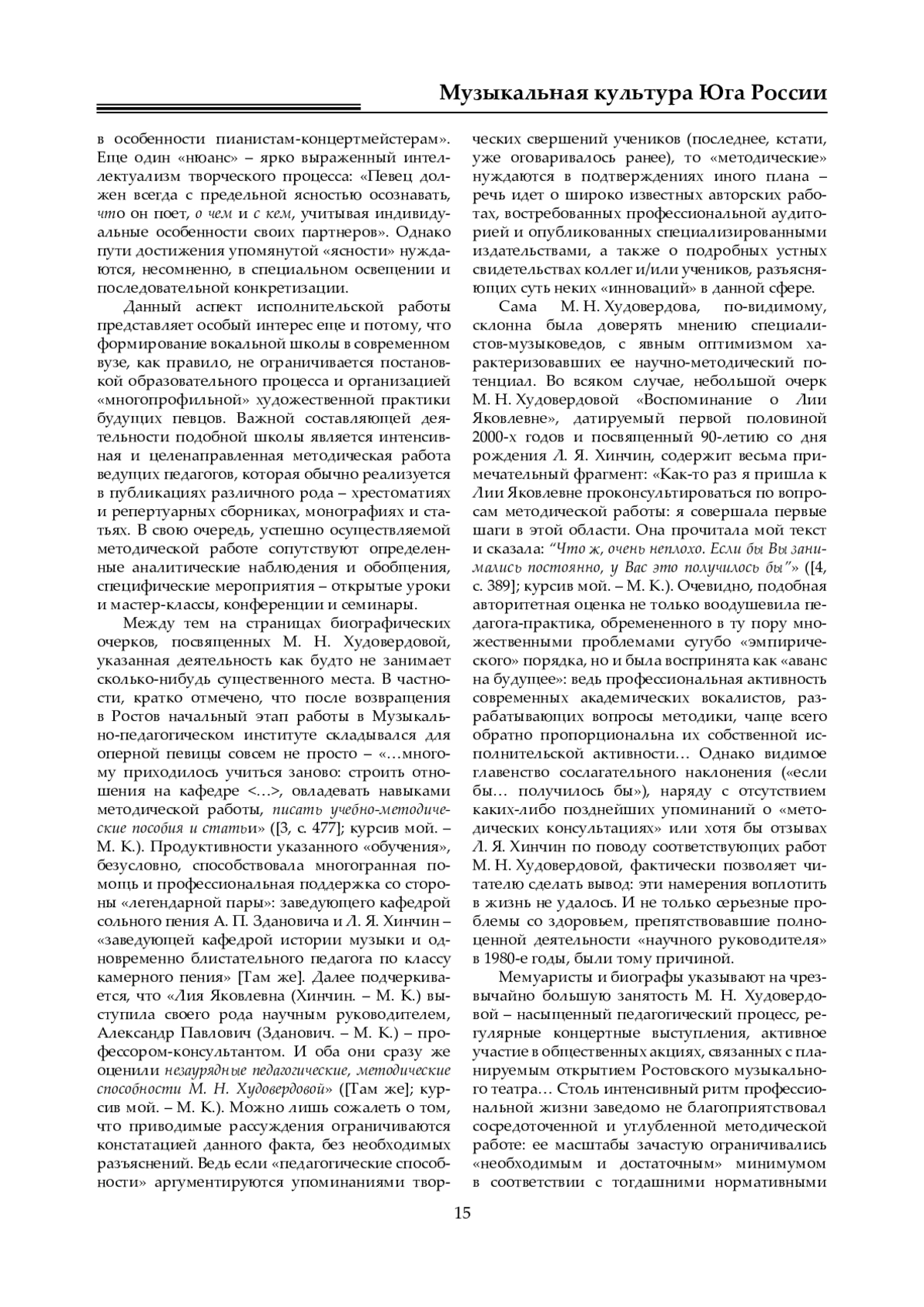 1. Смирнова Н. И. Педагогическое наследие М. Н. Худовердовой: Становление и развитие ростовской вокальной школы // Вестник Академии музыки. 2025. № 4. С. 45-53.
