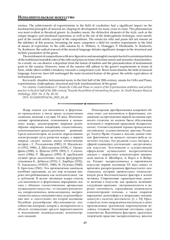 В центре внимания автора данной статьи - разнообразные трансформации стилевых и структурных признаков жанра сонаты для виолончели и фортепиано в контексте новаторских художественных исканий первой половины ХХ века. Достижения экспрессионизма в области лексики оказали существенное влияние на глубинные основы музыкального искусства, определив векторы его развития на долгие годы. Отмечается, что в театральных жанрах данное художественно-эстетическое явление запечатлелось наиболее полно. В камерной музыке отличительные черты экспрессионизма, такие как специфическая образно-эмоциональная атмосфера и ведущая роль додекафонной техники письма, выступали только определенной составляющей концептуальных замыслов вновь создаваемых произведений. Соната для виолончели и фортепиано оказалась вовлеченной в этот процесс, явившись для многих композиторов сферой творческих экспериментов по отношению к используемым средствам выразительности. В виолончельных сонатах А. Веберна, А. Онеггера, П. Хиндемита, Н. Рославца, Ю. Кочурова радикальное обновление музыкального языка предопределяет значительные изменения в области формы и стилевых параметров жанра. Названные опусы характеризуются преобладанием диссонирующих гармоний, акцентированной ритмики, дискретностью фактурных и мелодических линий. Помимо этого, в некоторых сонатах выдерживаются традиционные жанровые установки в области формы, наряду с общей тенденцией к сжатию цикла. Обогащение сочинений новыми образно-содержательными концептами сопровождается переосмыслением традиционных ансамблевых амплуа виолончели и фортепиано в плане фактурного изложения и семантических характеристик. В некоторых сонатах наблюдаются подчеркнутая дифференциация инструментальных партий и отказ от тембрового слияния. При этом видимые новации в области музыкального языка сочетаются с неизменным сохранением главного инвариантного признака жанра - художественной равнозначности инструментальных партий.