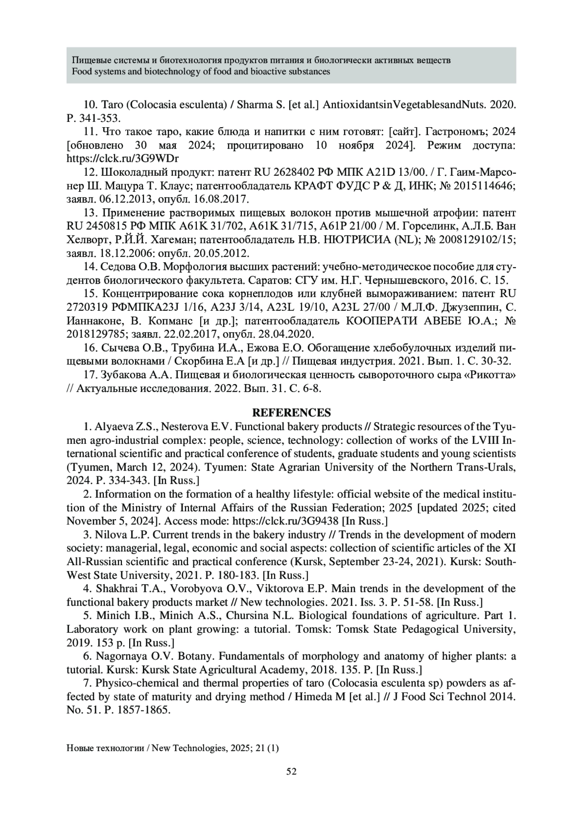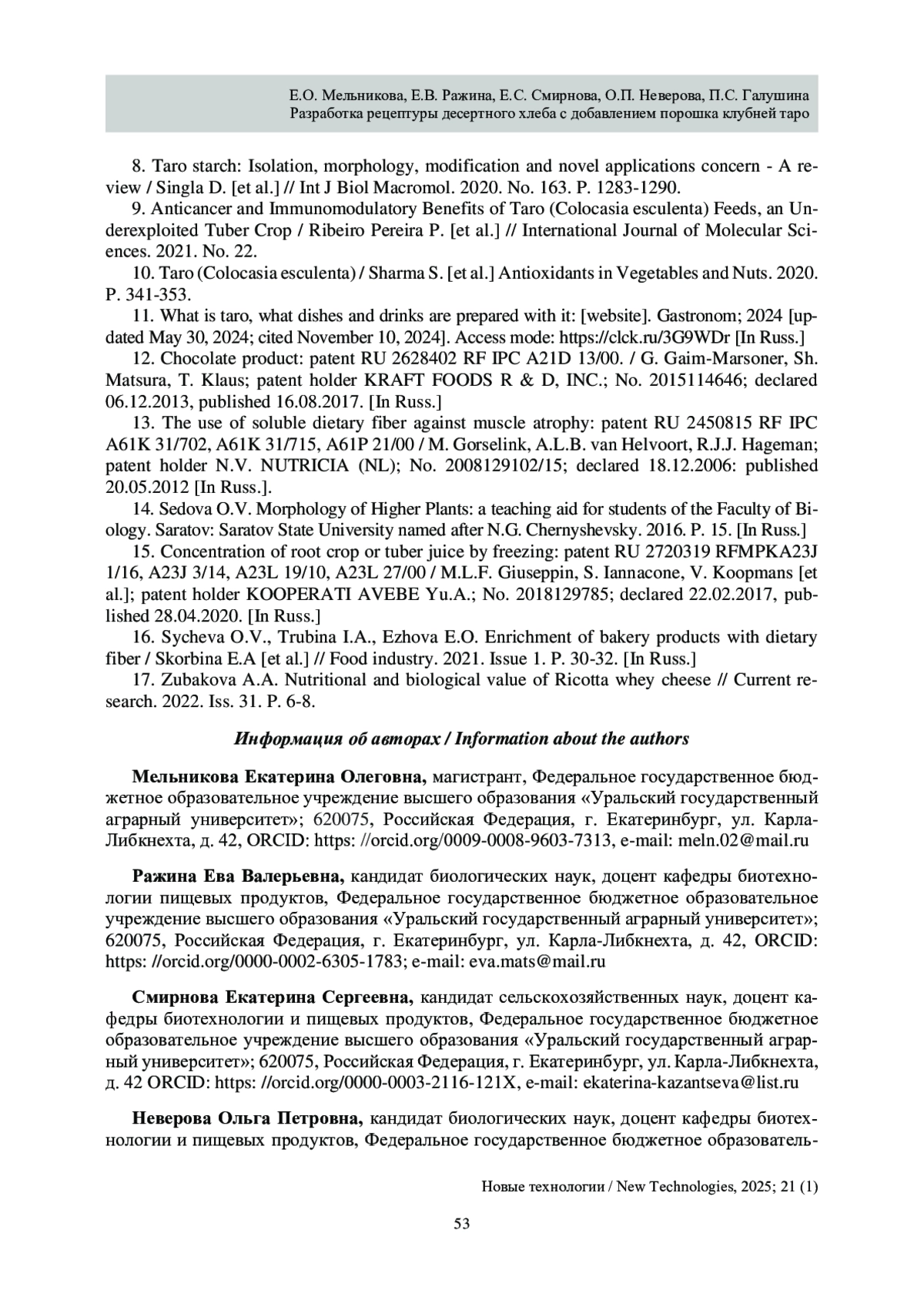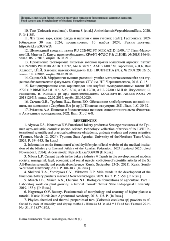 16. Sycheva O.V., Trubina I.A., Ezhova E.O. Obogashchenie khlebobulochnykh izdelii pishchevymi voloknami / Skorbina E.A [i dr.] // Pishchevaya industriya. 2021. Vyp. 1. S. 30-32.