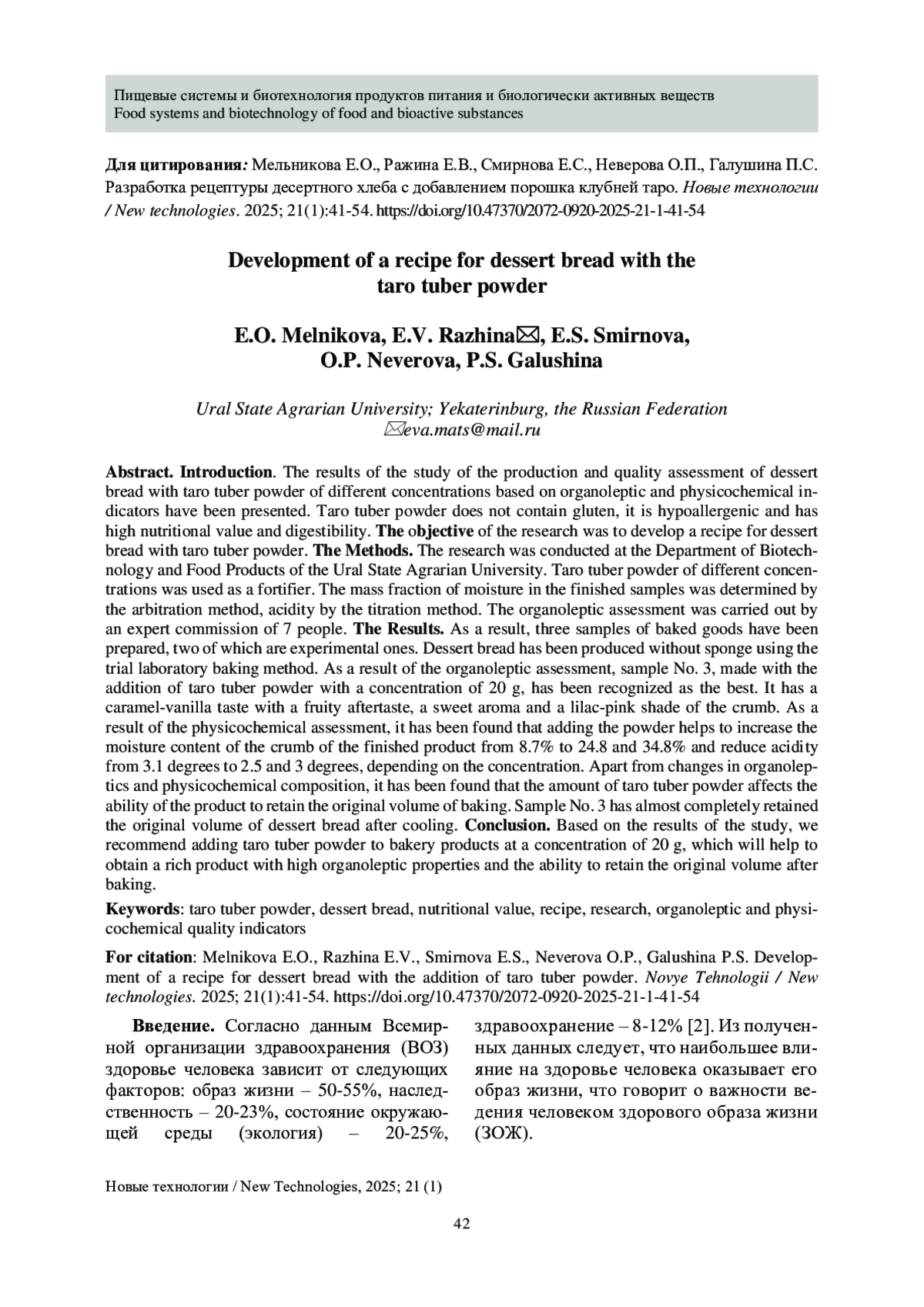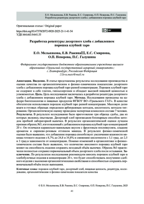 Введение. В статье представлены результаты исследования производства и оценки качества по органолептическим и физико-химическим показателям десертного хлеба с добавлением порошка клубней таро разной концентрации. Порошок клубней таро не содержит в себе глютен, гипоаллергенен и обладает высокой пищевой ценностью и усвояемостью. Цель. Цель исследования заключалась в разработке рецептуры десертного хлеба с добавлением порошка клубней таро. Методы. Исследования проведены на кафедре биотехнологии и пищевых продуктов ФГБОУ ВО «Уральского ГАУ». В качестве обогатителя использовали порошок клубней таро разной концентрации. Массовую долю влаги в готовых образцах определяли арбитражным методом, кислотность методом титрования. Органолептическую оценку проводила экспертная комиссия в составе 7 человек. Результаты. В результате исследования было приготовлено три образца сдобы, два из которых являлись опытными. Десертный хлеб производили безопарным способом методом пробной лабораторной выпечки. В результате органолептической оценки лучшим признан образец №3, изготовленный с добавлением порошка клубней таро концентрацией 20 г. Он отличался карамельно-ванильным вкусом с фруктовым послевкусием, сладким ароматом и сиренево-розовым оттенком мякиша. В результате физико-химической оценки было выявлено, что добавление порошка способствует увеличению влажности мякиша готового изделия с 8,7% до 24,8 и 34,8% и снижению кислотности с 3,1 град. до 2,5 и 3 град. в зависимости от концентрации. Помимо изменений в органолептике и физикохимическом составе было выявлено, что количество вносимого порошка клубней таро влияет на способность изделия сохранять исходный объём выпечки. Образец №3 практически полностью сохранил первоначальный объем десертного хлеба после остывания. Заключение. По результатам исследования рекомендуем вносить порошок клубней таро в хлебобулочные изделия в концентрации 20 г, что будет способствовать получению сдобного изделия с высокими органолептическими свойствами и способностью сохранять первоначальный объём после выпекания.