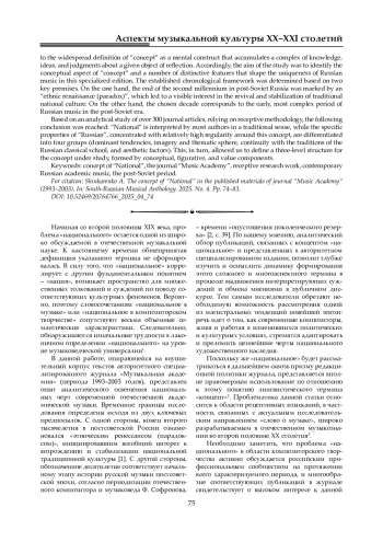 Начиная со второй половины XIX века, проблема «национального» остается одной из широко обсуждаемой в отечественной музыкальной науке. К настоящему времени общепринятая дефиниция указанного термина не сформировалась. В силу того, что «национальное» коррелирует с другим фундаментальным понятием – «нация», возникает пространство для множественных толкований и суждений по поводу соответствующих культурных феноменов. Вероятно, поэтому словосочетаниям «национальное в музыке» или «национальное в композиторском творчестве» сопутствуют весьма объемные семантические характеристики. Следовательно, обнаруживаются изначальные трудности в лаконичном определении «национального» на уровне музыковедческой универсалии.