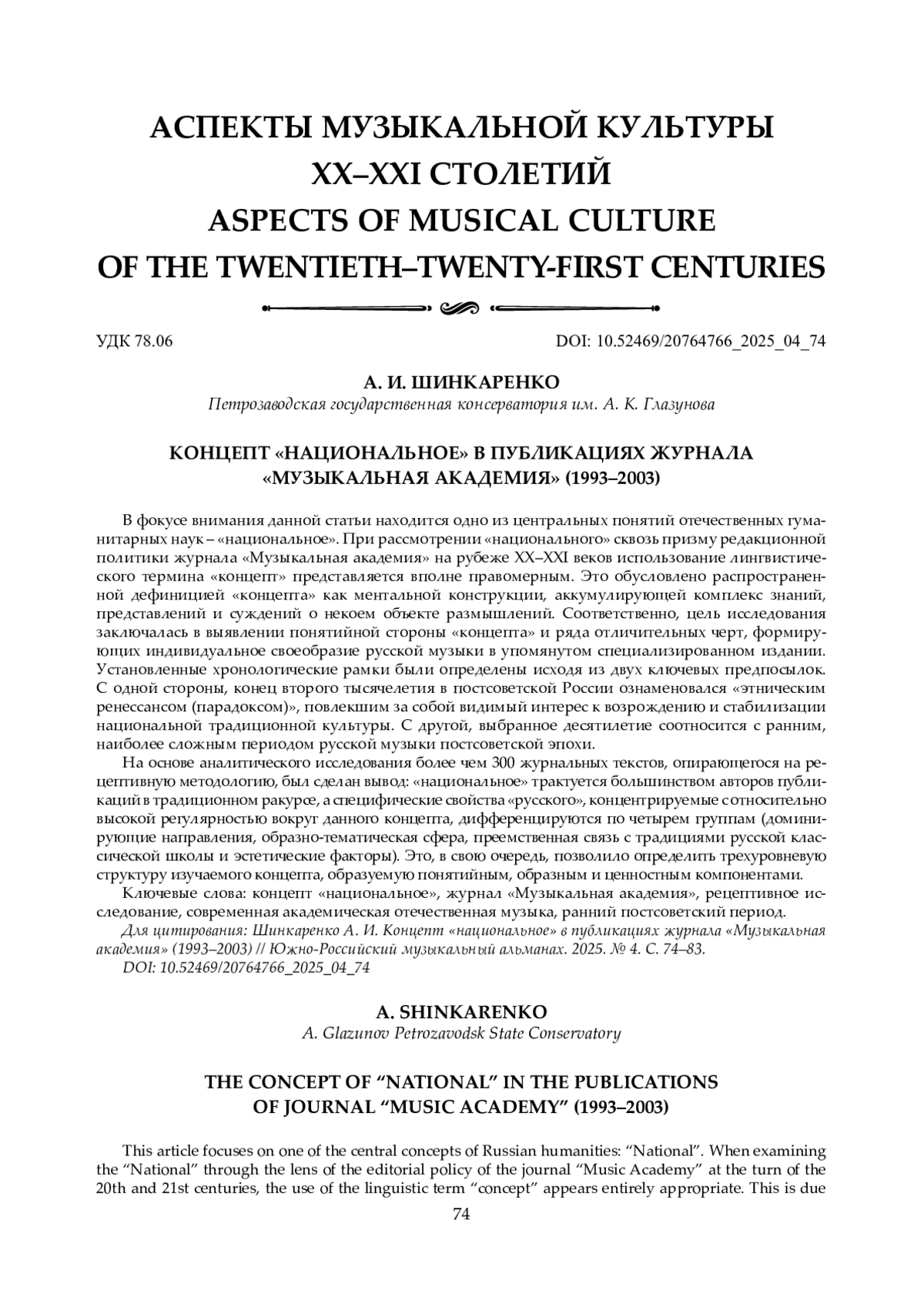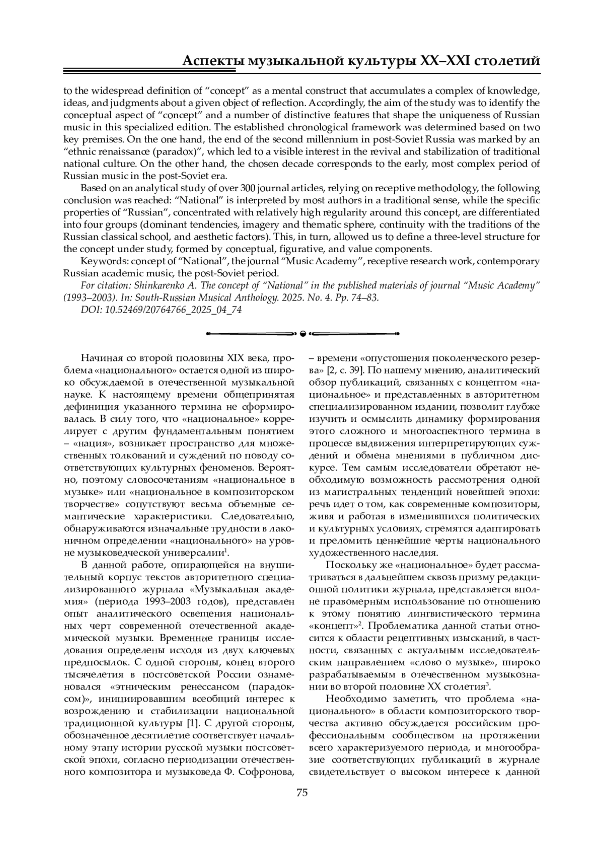 В фокусе внимания данной статьи находится одно из центральных понятий отечественных гуманитарных наук - «национальное». При рассмотрении «национального» сквозь призму редакционной политики журнала «Музыкальная академия» на рубеже XX-XXI веков использование лингвистического термина «концепт» представляется вполне правомерным. Это обусловлено распространенной дефиницией «концепта» как ментальной конструкции, аккумулирующей комплекс знаний, представлений и суждений о некоем объекте размышлений. Соответственно, цель исследования заключалась в выявлении понятийной стороны «концепта» и ряда отличительных черт, формирующих индивидуальное своеобразие русской музыки в упомянутом специализированном издании. Установленные хронологические рамки были определены исходя из двух ключевых предпосылок. С одной стороны, конец второго тысячелетия в постсоветской России ознаменовался «этническим ренессансом (парадоксом)», повлекшим за собой видимый интерес к возрождению и стабилизации национальной традиционной культуры. С другой, выбранное десятилетие соотносится с ранним, наиболее сложным периодом русской музыки постсоветской эпохи. На основе аналитического исследования более чем 300 журнальных текстов, опирающегося на рецептивную методологию, был сделан вывод: «национальное» трактуется большинством авторов публикаций в традиционном ракурсе, а специфические свойства «русского», концентрируемые с относительно высокой регулярностью вокруг данного концепта, дифференцируются по четырем группам (доминирующие направления, образно-тематическая сфера, преемственная связь с традициями русской классической школы и эстетические факторы). Это, в свою очередь, позволило определить трехуровневую структуру изучаемого концепта, образуемую понятийным, образным и ценностным компонентами.
